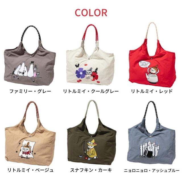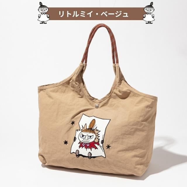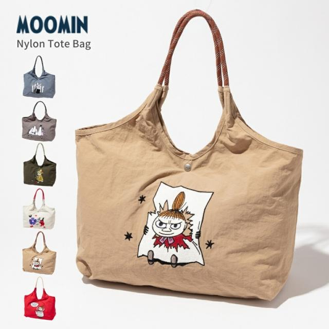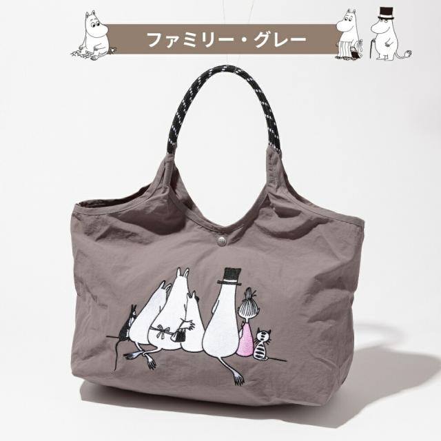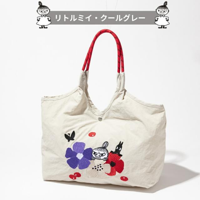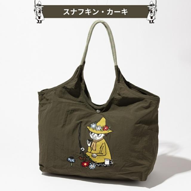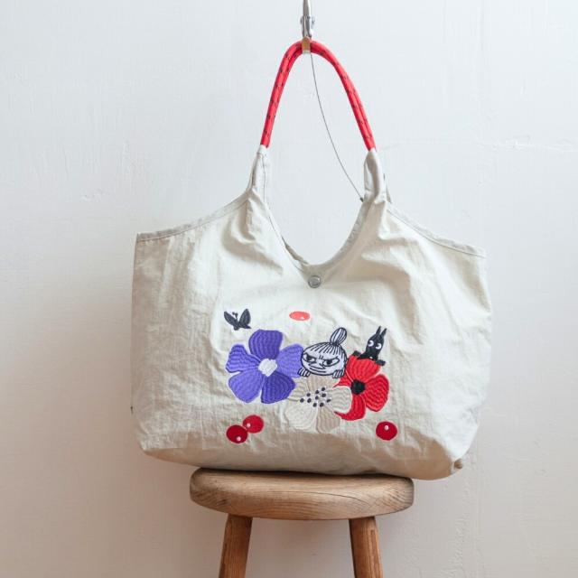 ムーミンや、仲間たちが大きく刺繍されたナイロントートバッグ