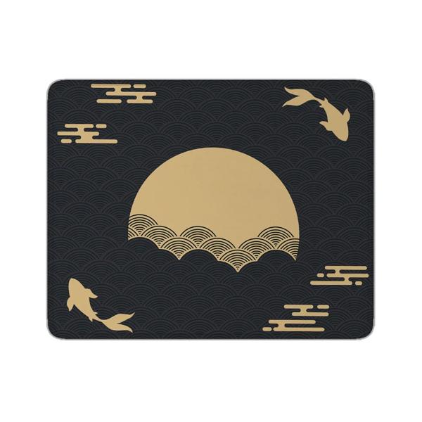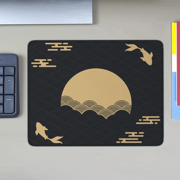 日本の革のデスクマット小さなマウスパッド、黒と金の機微なパッド、クオの魚、太陽クラウド、日本の芸術、シール、日の出、日没、ゲームの落書きマット