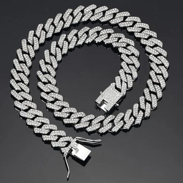 男性と女性のためのキューバリンクチェーンネックレス,ヒップホップスタイル,シルバーカラー,ラインストーン,アイス,パンクジュエリー,ギフト,15mm