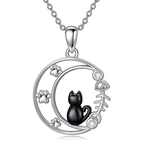 女性のためのかわいい子猫のペンダント付きネックレス,ペンダント付きの黒い猫のガラスの月の形をした素敵な宝石