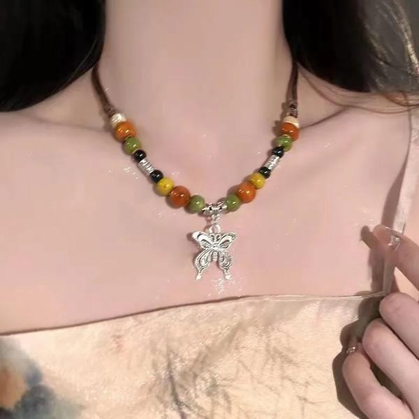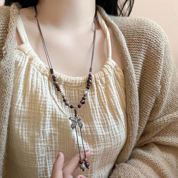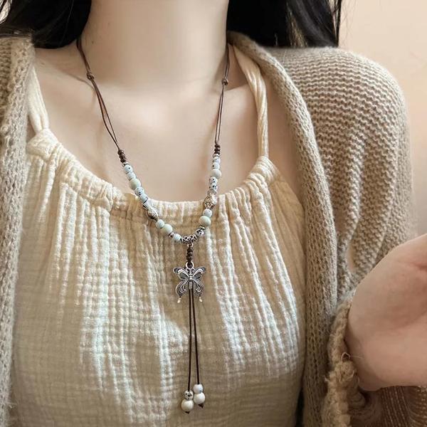 女性のためのヴィンテージセラミックバタフライペンダントネックレス,新しい中国のエスニックスタイル,長く調整可能,手作りのビーズジュエリー