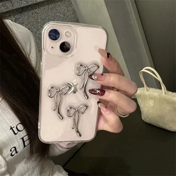 3Dメタルボウノットケース,透明エポキシシェル,iPhone 16,15,14,13,12,11 pro max,mini,xr,7,8 plus,se