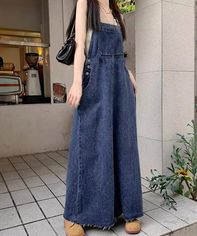 ゆったりとしたシルエット、カジュアルでリラックスしたスタイリングにぴったりのロング丈デニムサロペットスカート