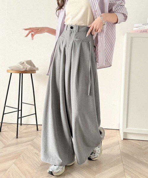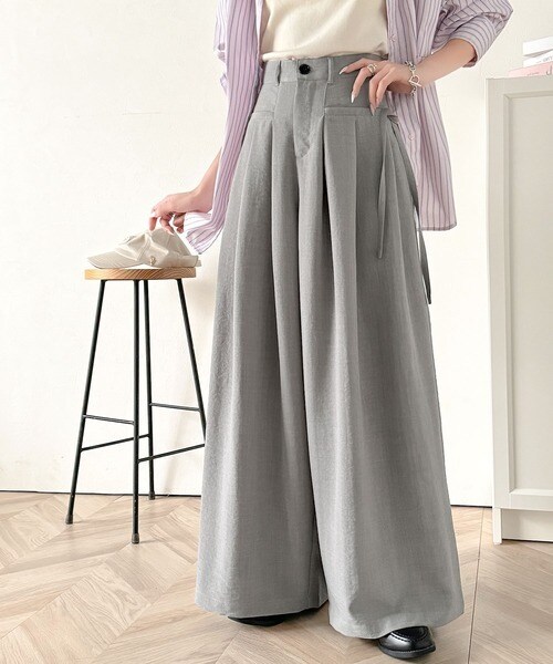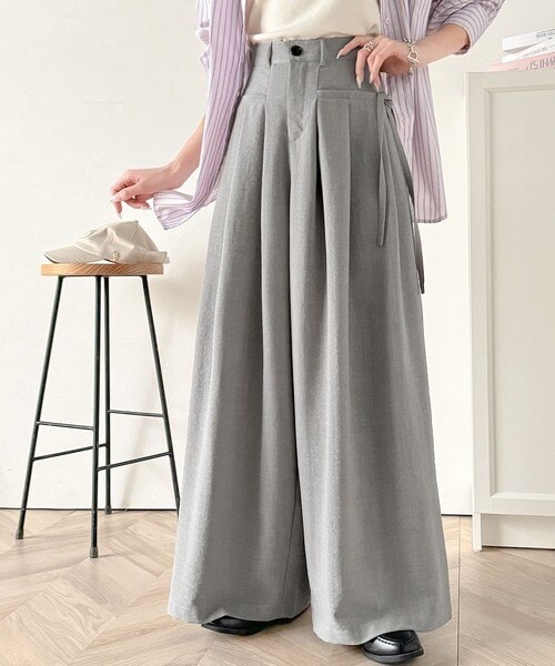 動くたび軽やか上品シルエット。サイドリボン付き3タックハイウエストワイドパンツ