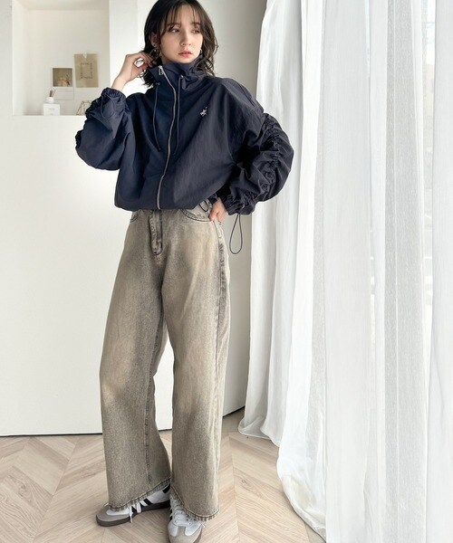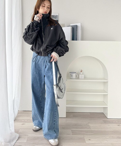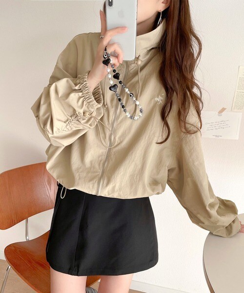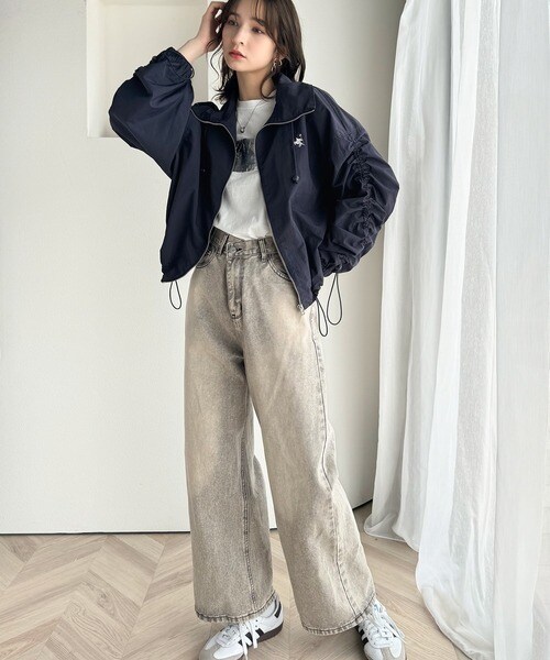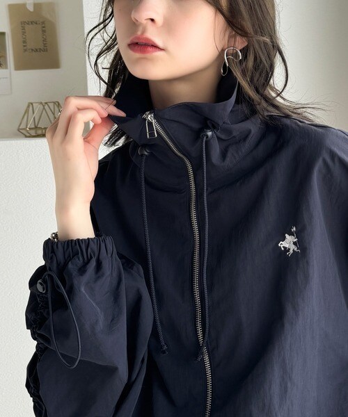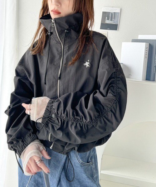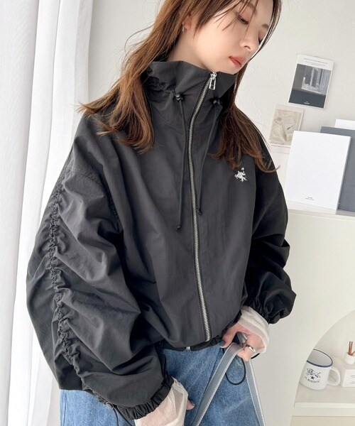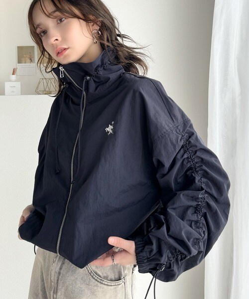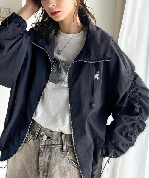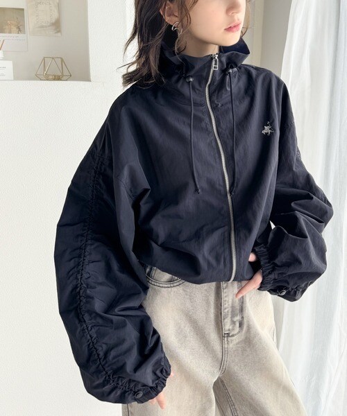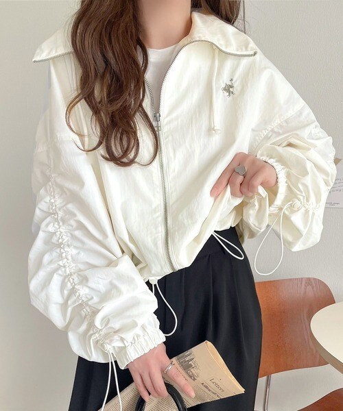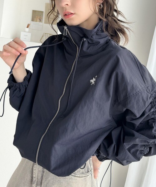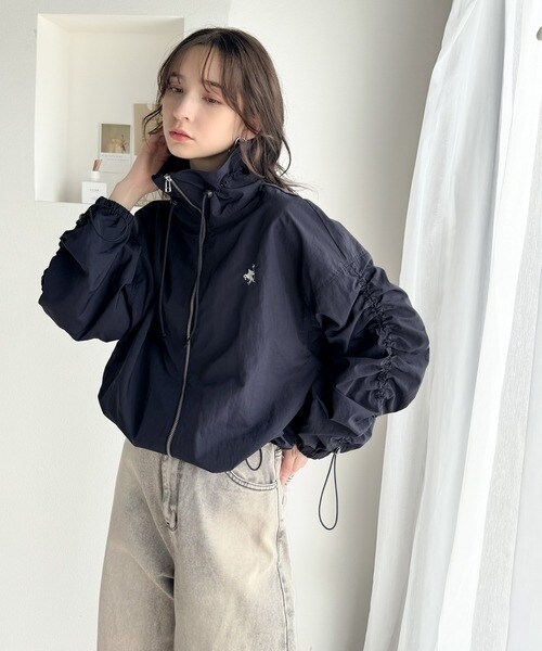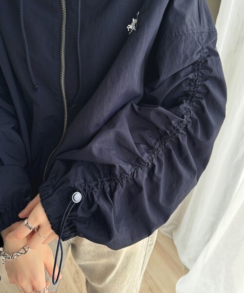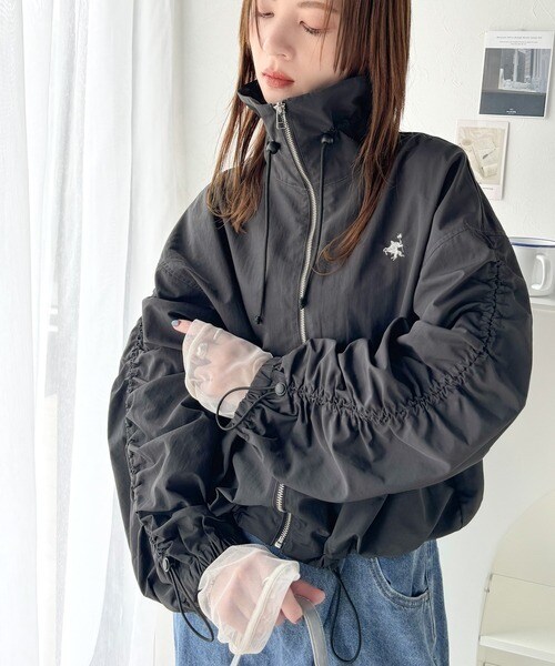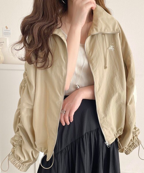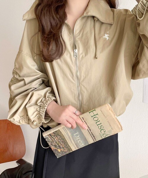 絞りが可愛い大人のカジュアル。ギャザースリーブ胸刺繍ナイロンブルゾン