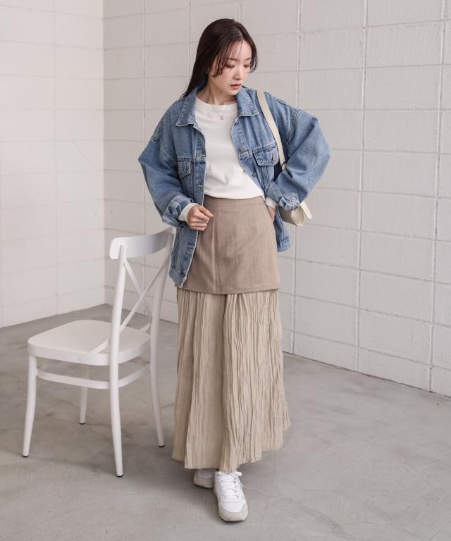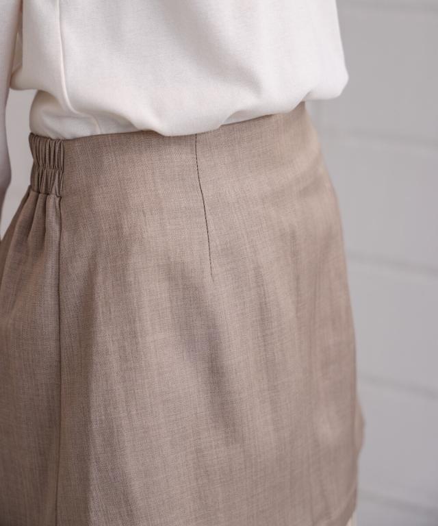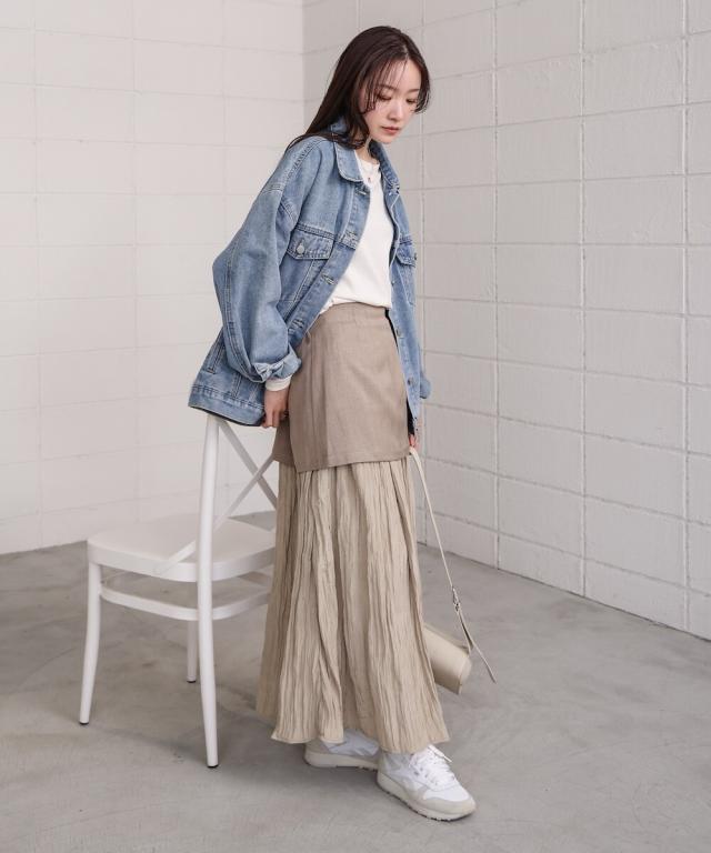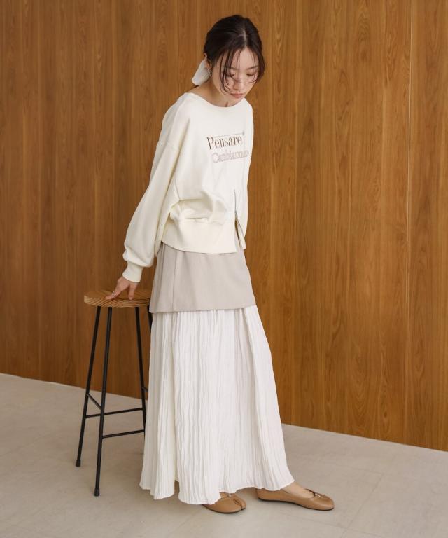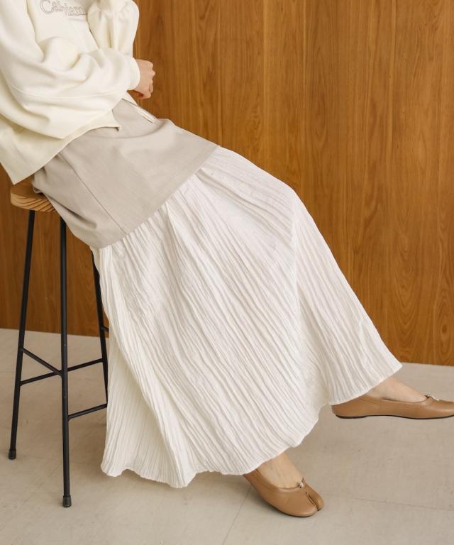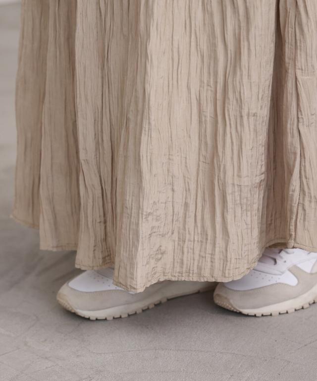 上の生地は程よい厚めのさりげない光沢感のある生地を採用しております。体のラインを拾わず安心してご着用していただけます。下の生地はシャイニー感のある生地で歩くたびになびいて、気分も上がること間違いなし!しわ加工が施されておりますのでアイロン要らずでOK!