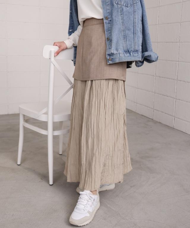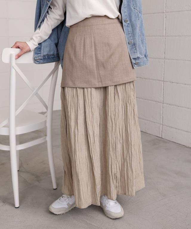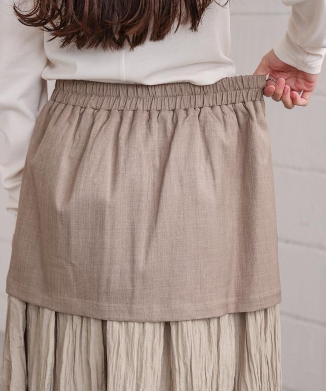 異素材が重なった、レイヤード風ドッキングスカートが登場!程よいシャイニー感のあるしわプリーツスカートと、厚手のミニスカートが重なった、ほかにはないデザインです。お手持ちのシンプルなトップスの下に履くだけでトレンド感がUPします。後ろはウエストがゴムになっており着脱も楽々です。