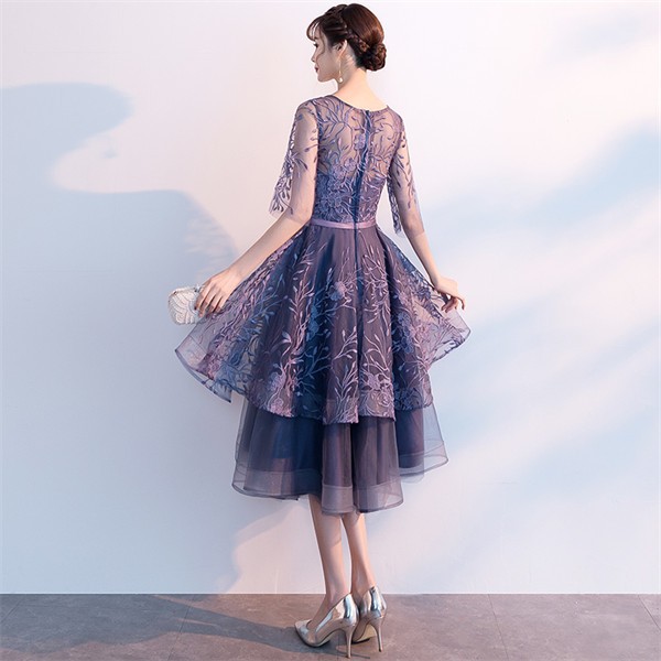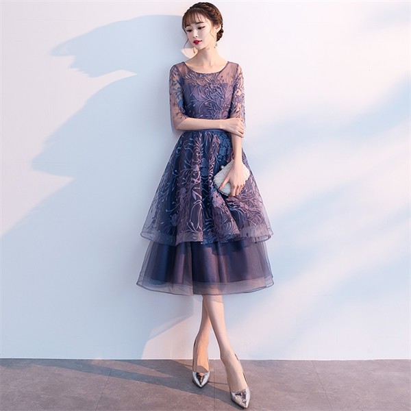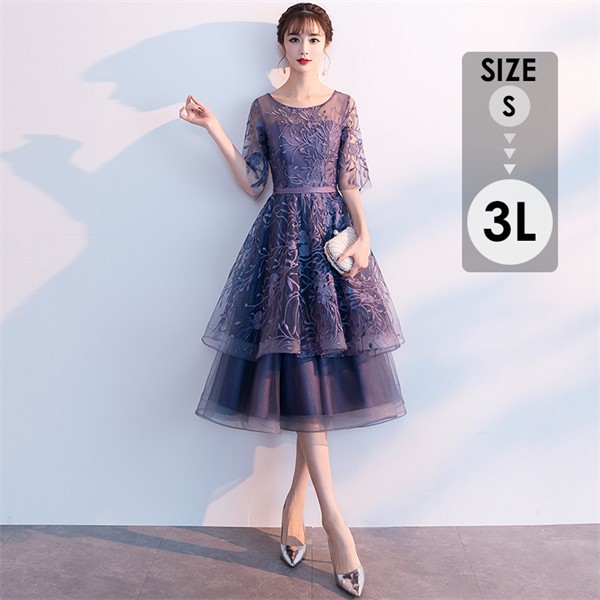 ドレス 大人 ピアノ発表会 ドレス 演奏会 ミモレ丈 結婚式 パーティードレス ミモレ丈ドレス ファスナー お呼ばれ 袖あり 高級感 二次会 20代 30代 きれいめ パープル