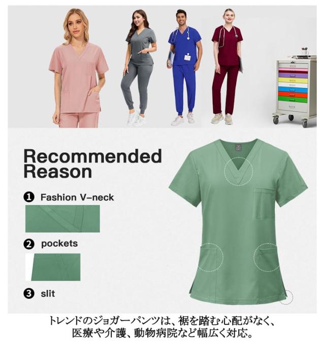 | スクラブとジョガーパンツ上下セット。 高級感があり、清潔な印象を与えます。 軽くて涼しい薄手の生地で、夏場の使用にピッタリです。 トレンドのジョガーパンツは、裾を踏む心配がなく、医療や介護、動物病院など幅広く対応。 | |