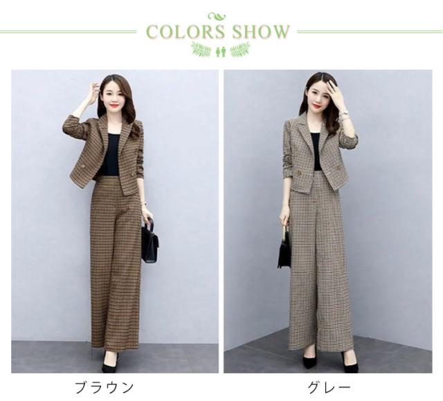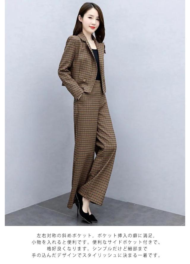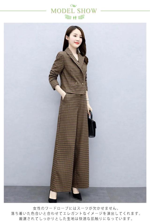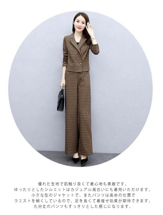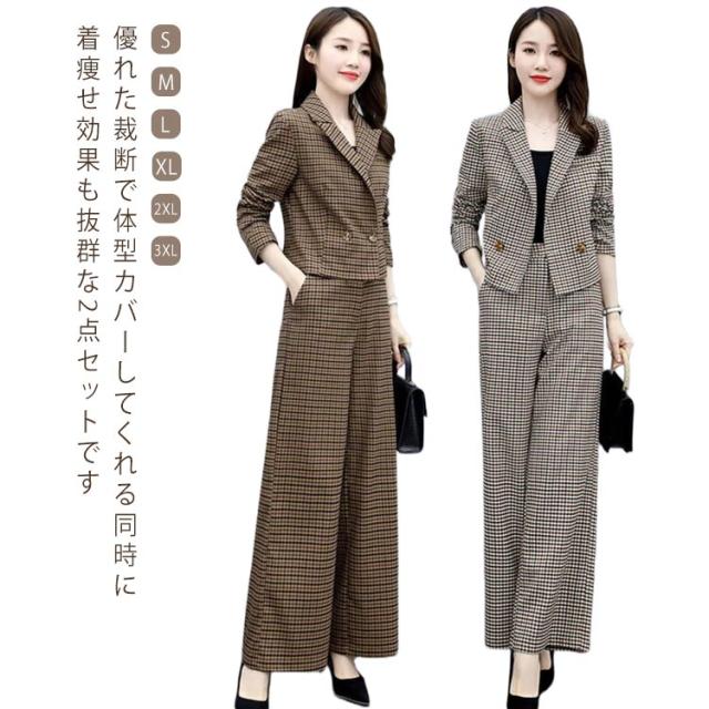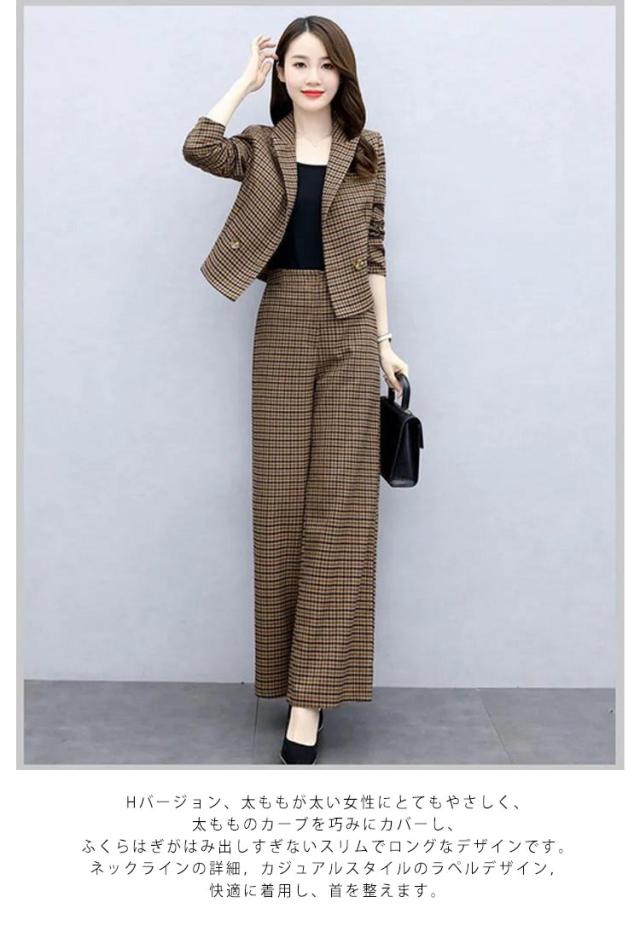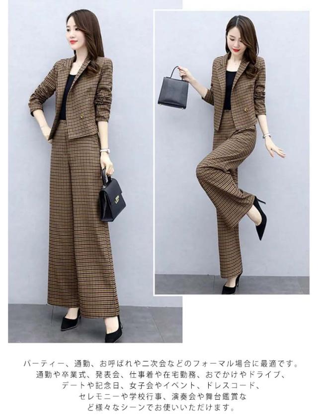 セットアップ レディース パンツスーツ ワイドパンツ パンツドレス 2点セット 入学式 スーツ ママ コーデ パンツスーツ ビジネス オフィス 卒業式 入園式 卒園式 セレモニー チェック 大人 きれいめ ゆったり 春 秋 冬