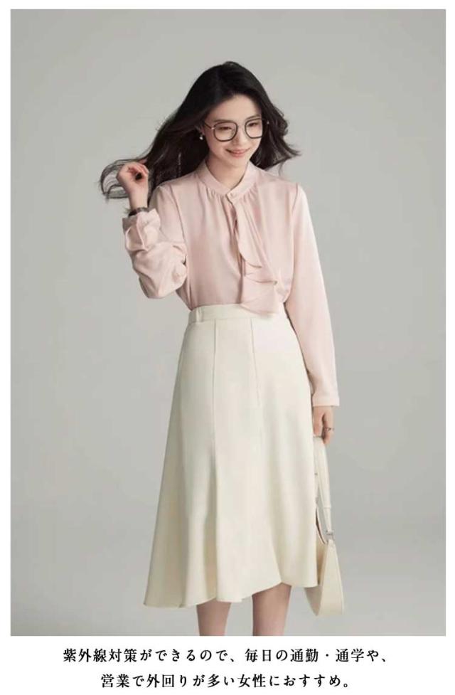 | 首元のボウタイデザインがきちんと感を醸し出してくれるブラウス。 光沢感のあるさらりとした生地、透け感が抑えられているのもポイント。 柔らかく軽やかな着心地でご家庭でのお手入れも簡単。 紫外線対策ができるので、毎日の通勤・通学や、営業で外回りが多い女性におすすめ。 通勤はもちろん、フォーマルシーンにもピッタリの大人の気品漂うエレガンスな一枚です。 | |