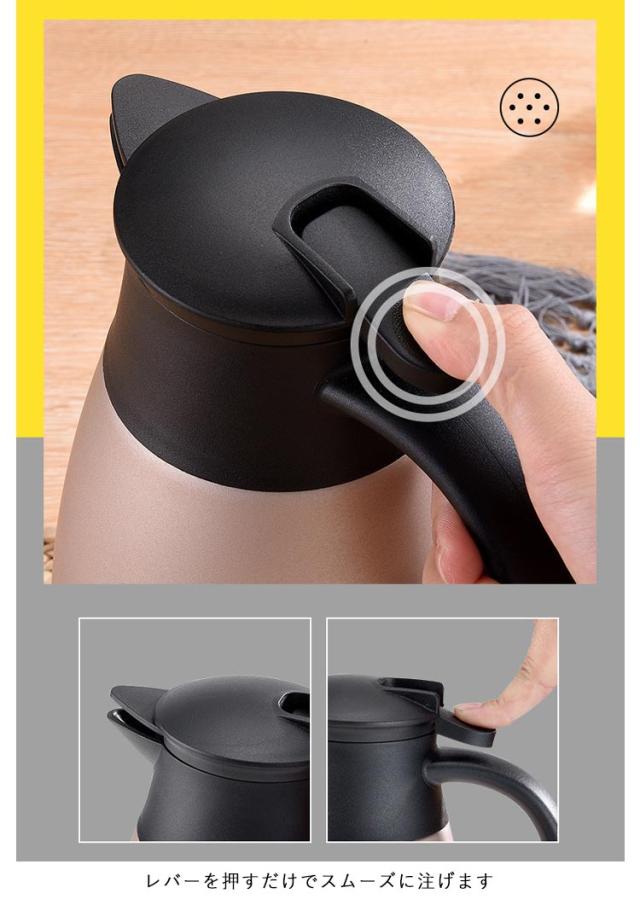 | ステンレス真空断熱構造で保温と保冷に優れています。 本体は衝撃に強いステンレス製。 レバーを押すだけでスムーズに注げます。 電気を使用しないで保温保冷するので、とってもエコ。 コンセント要らずなので、好きな場所で使えます。 持ち運びと注ぎに便利な大きなハンドル。 食卓、リビング、在宅ワーク、オフィス、レストラン、食堂、喫茶店、旅館、民宿、ホテルなどに好適品。 | |
