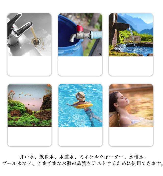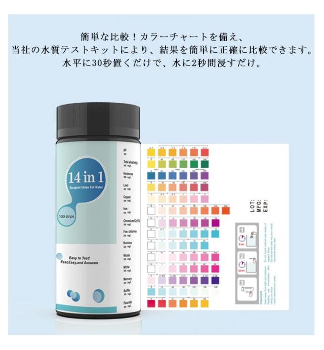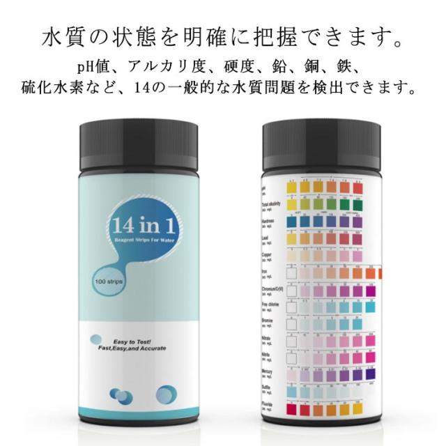 | 水質の状態を明確に把握できます。 pH値、アルカリ度、硬度、鉛、銅、鉄、硫化水素など、14の一般的な水質問題を検出できます。 簡単な比較!カラーチャートを備え、当社の水質テストキットにより、結果を簡単に正確に比較できます。 水平に30秒置くだけで、水に2秒間浸すだけ。 井戸水、飲料水、水道水、ミネラルウォーター、水槽水、プール水など、さまざまな水源の品質をテストするために使用できます。 プロの水質試験機関や高価な機器は必要ありません。 この水質テストキットを使えば、自宅で水のpH、硬度、塩素などのパラメーターを簡単かつ迅速に確認できます。 | |