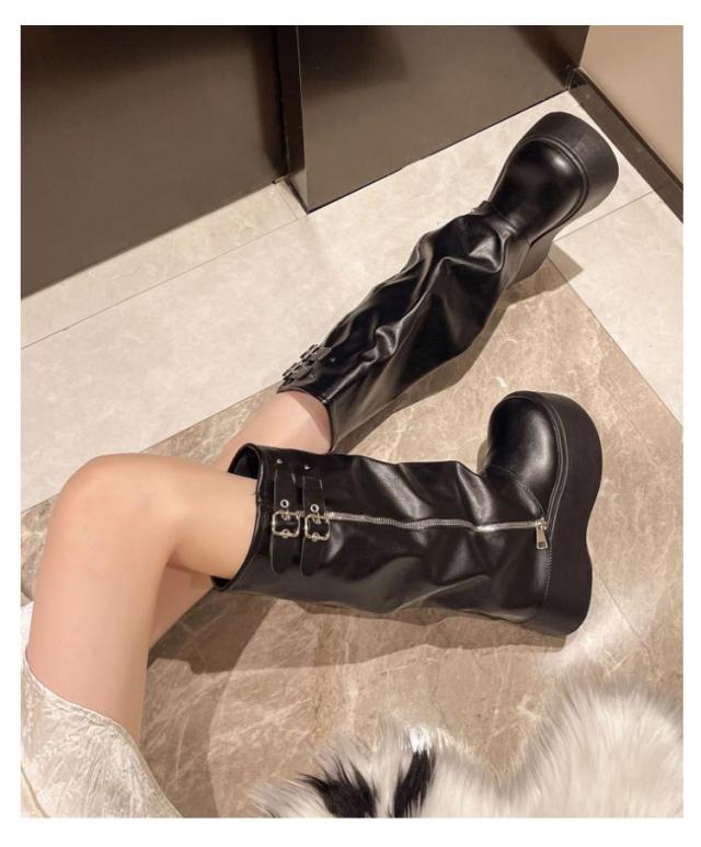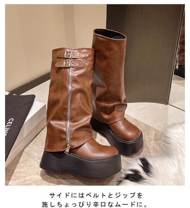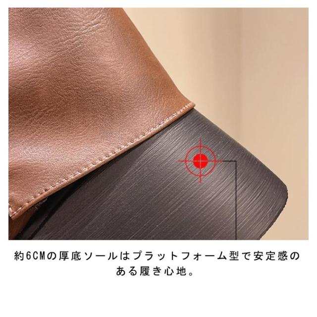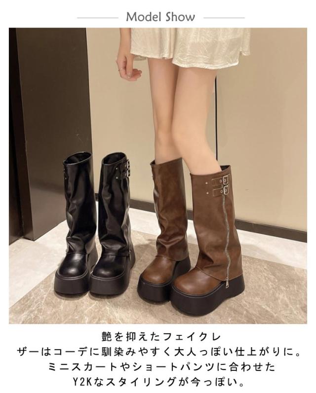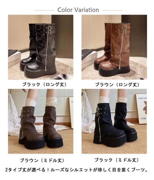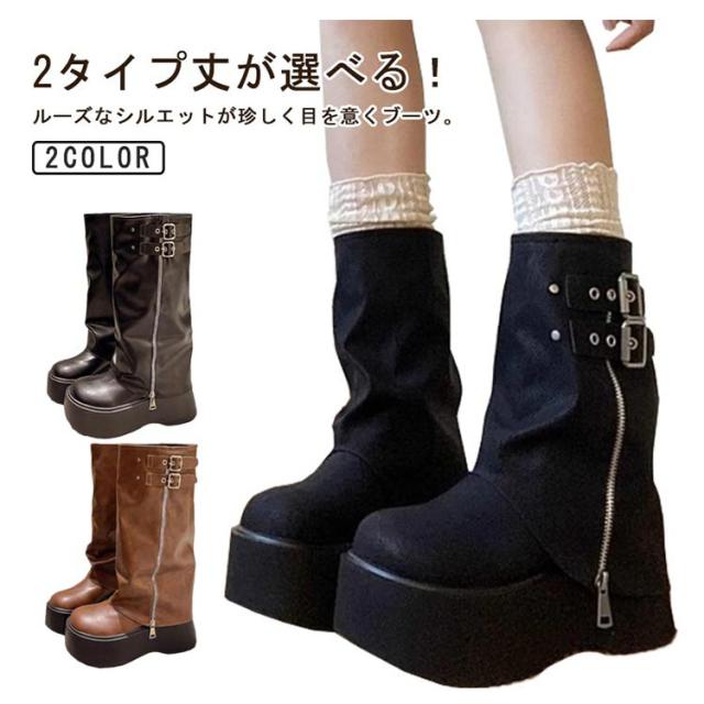 2タイプ丈が選べる ミドルブーツ ブーツ きれいめ プラットフォーム 靴 ジップシューズ PUレザー ベルト付き 厚底 ロングブーツ 6cmヒール 女っぽ カジュアル yk2 大人っぽ ゆったり フェミニン カジュアル おしゃれ 痛くない 疲れない 秋 冬 美脚効果