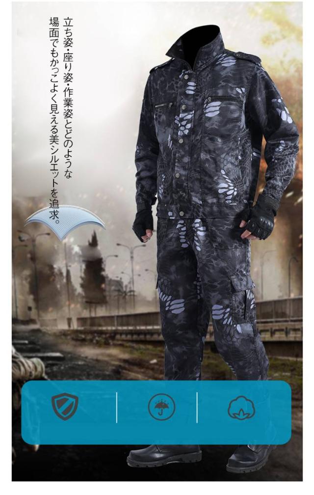 | 多機能の迷彩柄作業着上下セット。 立ち姿・座り姿・作業姿とどのような場面でもかっこよく見える美シルエットを追求。 胸には大きめのポケット、膝ぐらいのポケット、さらに腰部の左右にもポケットを配置し、収納箇所が充実。 シンプルな中に光るこだわりのデザイン。作業シーンを選ばないワークウェア! カジュアルから作業着まで使えて、長時間愛用できるアイテム。 | |