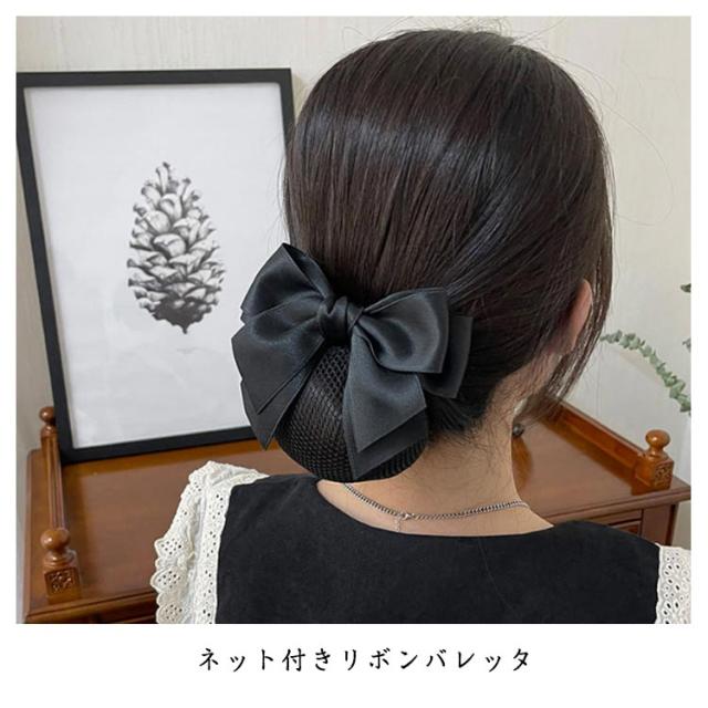リボンバレッタ 【2個セット】 ネット付 シニヨン バレッタ サテンリボン お団子ネット お団子カバー まとめ髪 髪留め シンプル オフィス 冠婚葬祭 お葬式 お団子ネット 簡単 ヘアアレンジ 無地 送料無料