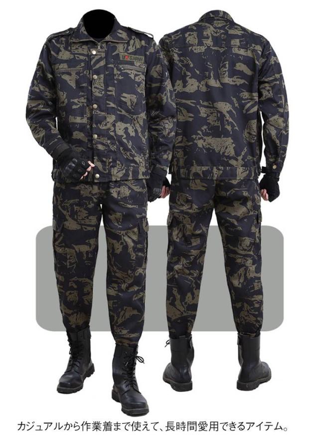 | 多機能の迷彩柄作業着上下セット。 立ち姿・座り姿・作業姿とどのような場面でもかっこよく見える美シルエットを追求。 胸には大きめのポケット、膝ぐらいのポケット、さらに腰部の左右にもポケットを配置し、収納箇所が充実。 シンプルな中に光るこだわりのデザイン。作業シーンを選ばないワークウェア! カジュアルから作業着まで使えて、長時間愛用できるアイテム。 | |