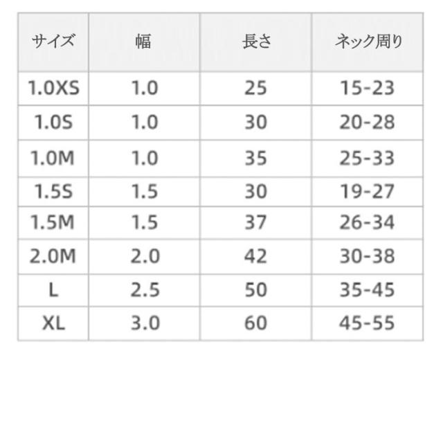 | サイズについての説明 | 1.0XS:1.0*25cm 1.0S:1.0*30cm 1.0M:1.0*35cm 1.5S:1.5*30cm 1.5M:1.5*37cm L:2.0*42cm XL:2.5*50cm XXL:3.0*60cm ※実寸はメジャー採寸の為、若干の誤差が生じる場合があります。 |