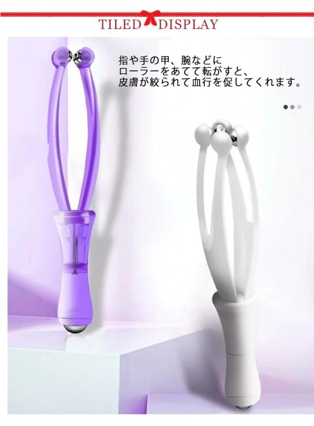 | 指に挟んでゴクラク!指用のハンドローラーが新登場! 指や手の甲、腕などにローラーをあてて転がすと、皮膚が絞られて血行を促してくれます。 持ち手のとがった先端で足裏や手などのツボをぐりぐりと刺激もできます。 首、肩、腕、腹部、腰、太もも、ふくらはぎ等幅広くお使いいただけます。 指を1本ずつ挟むようにして上下にコロコロ刺激を与えて、 お家やオフィスで手軽にできる手ツボ刺激グッズ。 | |