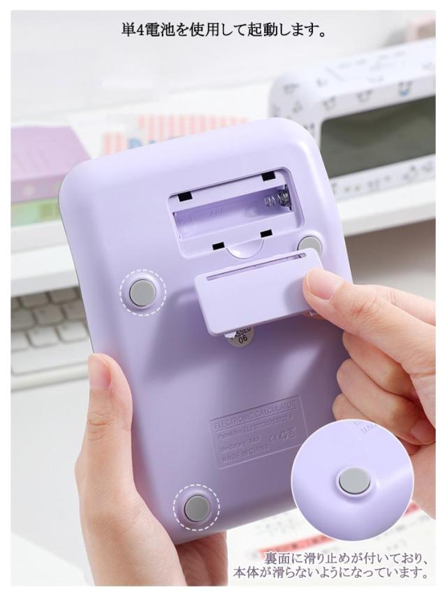 | 毎日がもっとワクワクする、ポップでキュートな電卓。 そのままデスクに置いておいてもインテリアになるおしゃれなデザインです かわいく丸いキーボタンを採用し、カジュアルなデザインとの統一感を演出。 親しみやすいラウンドフォルムと丸みを持たせたサイドの形状で、手にした際に持ちやすく 裏面に滑り止めが付いており、本体が滑らないようになっています。 ディスプレイ部分は15度傾斜しており、画面を見るのに最適な角度です。 単4電池を使用して起動します。 数分間使用を停止すると、自動で電源がオフされます。 | |