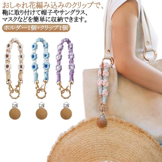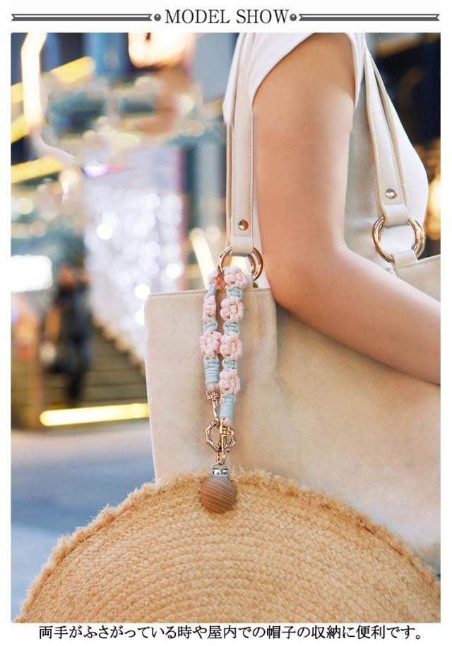 | おしゃれ花編み込みのクリップで、 鞄に取り付けて帽子やサングラス、 マスクなどを簡単に収納できます。 両手がふさがっている時や屋内での帽子の収納に便利です。 帽子クリップとしての主な用途以外に、キーホルダー、サングラスと眼鏡クリップ、スマホストラップとしても使用可能です。 | |
