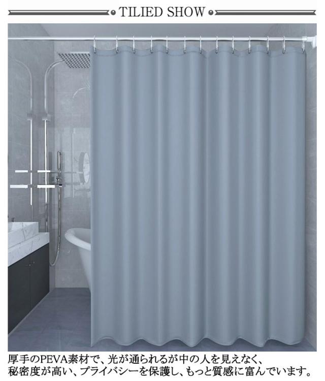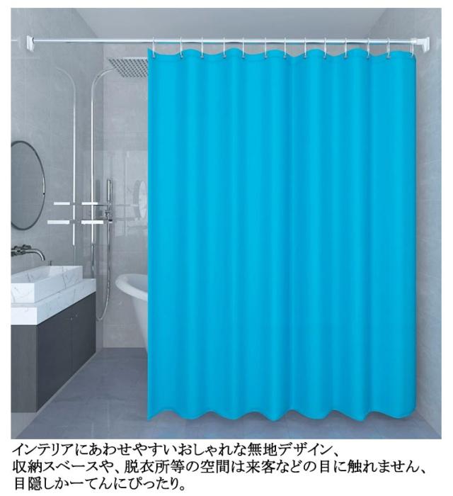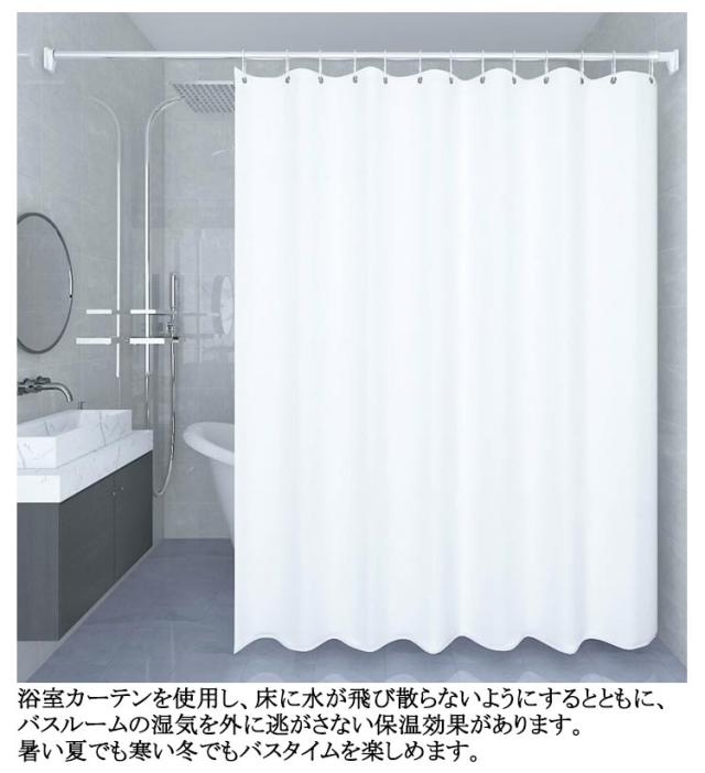 | 採光性よく、透けない・遮像・厚手のPEVAシャワーカーテン。 厚手のPEVA素材で、光が通られるが中の人を見えなく、秘密度が高い、プライバシーを保護し、もっと質感に富んでいます。 防水性・防カビに優れ、熱や冷気を通しにくい。浴室のシャワーカーテンとしてはもちろん、ちょっとした目かくしや、暖房、冷房の効率アップにも。 透けないからシャワーする時がとても安心。収納スベースや、脱衣所等の空間は来客などの目に触れません、目隠しかーてんにもぴったり。 浴室カーテンを使用し、床に水が飛び散らないようにするとともに、バスルームの湿気を外に逃がさない保温効果があります。暑い夏でも寒い冬でもバスタイムを楽しめます。 上部合金製ハトメ加工、錆びにくく、長く綺麗にお使いただけます。 カーテンリング付属しているので、カーテンポールに引っ掛けるだけで取付できます。(カーテンポールは付属しません。) インテリアにあわせやすいおしゃれな無地デザイン、収納スベースや、脱衣所等の空間は来客などの目に触れません、目隠しかーてんにぴったり。 | |
