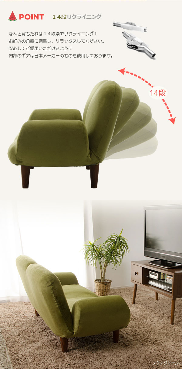 | ・背もたれ14段階リクライニング ・コンパクトながらしっかり二人座れるサイズ ・本物の木のような木目調の樹脂脚 ・ポケットコイル使用 ・安心の日本製 |