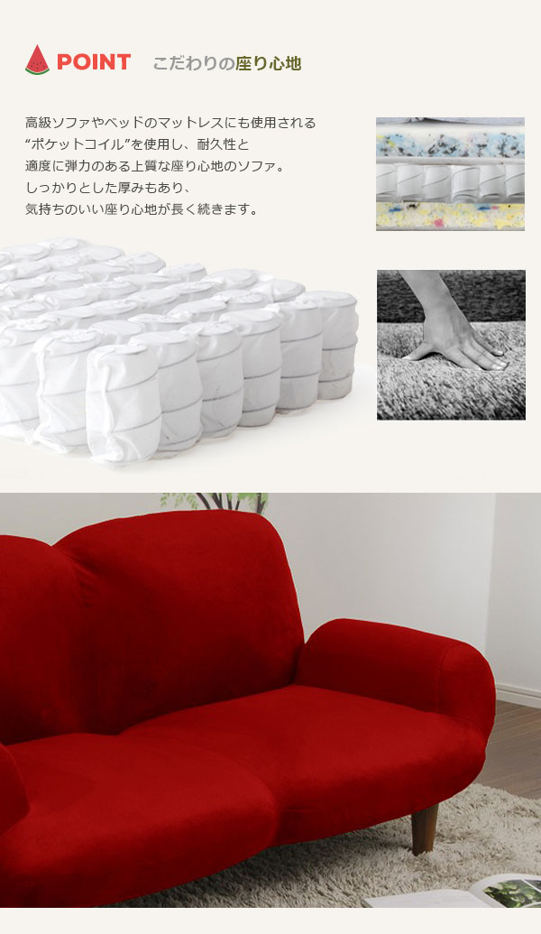 | コロンとしたかわいいフォルムのソファ。 丸みを帯びた肘掛けがかわいらしく、お部屋をおしゃれに演出します。 コンパクトなサイズながらしっかり二人座れます。 背もたれはお好みの角度に調整できる14段階リクライニング。 内部のギアは日本メーカーのものを使用しております。 高級ソファやベッドのマットレスなどにも使用されるポケットコイルを使用し、耐久性と適度な弾力のある上質な座り心地。 しっかりとした厚みもあり、気持ちのいい座り心地が長く続きます。 国内工場で一つ一つ丁寧に手作りしています。 |