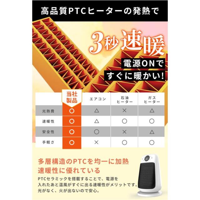ヒーター セラミックヒーター ファンヒーター 電気ストーブ 足元ヒーター 90°首振り 3秒速暖 3段階切替 PSE認証済み