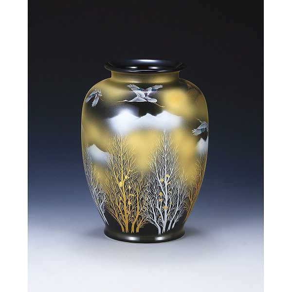 幻想的な仕上がりが特徴の「吹き付け技法」により連山と雲海を描き、その中を舞い飛ぶ群鶴を絵付けした大変縁起の良い花瓶です。。季節や場所を問わず、お楽しみいただけます。