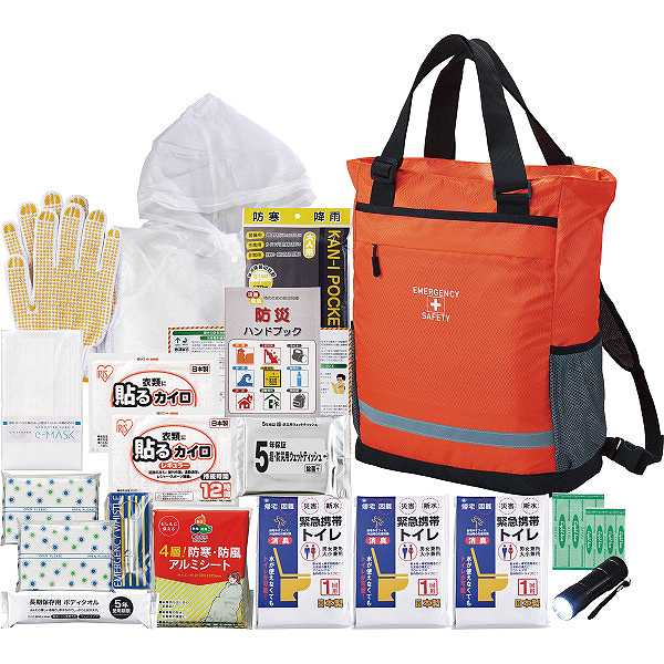 ●商品内容:2WAYリュック・9光ライト(単4乾電池3本使用・別売)・ホイッスル・ウェットティッシュ(20枚)・軍手・カイロ×2・レインコート・防寒アルミシート・緊急携帯トイレ1P×3・ポケットティッシュ×2・絆創膏・保存用ボディタオル・マスク・防災ハンドブック●絆創膏=医療機器届出番号27B3X00138000001