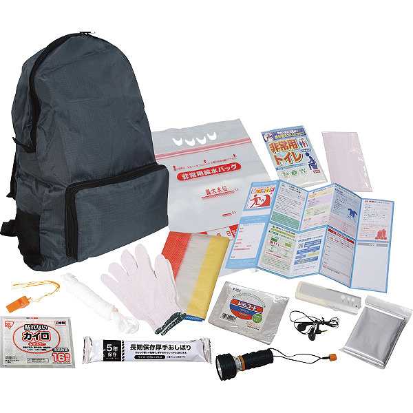 ●商品内容:リュック、非常用給水バック(約3l)、軍手、ロープ、笛、長期保存厚手おしぼり、防寒シート、ハンディライト、コンパクトFMラジオ、非常用トイレ、レジャーシート1畳用、マスク、カイロ、レインコート、防災ガイド×各1