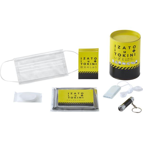 ●商品内容:防災缶・アルミシート・マスク・防災のしおり・ミニライト・ホイッスル・圧縮タオル