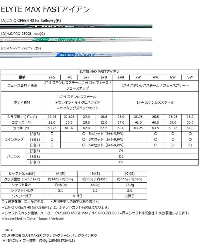 キャロウェイ ELYTE MAX FAST アイアン 5本セット(I#6-9、PW)LIN-Q GREEN 40 for Callaway(R)カーボンシャフト 2025年モデル[日本仕様][Callaway][エリート マックス ファスト アイアンセット]