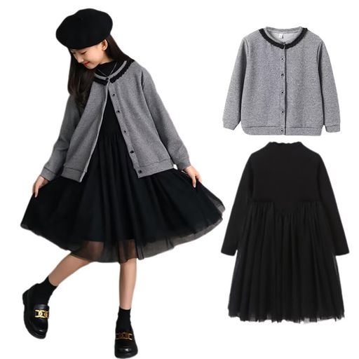 [KUHVVSE] 女の子 ワンピース カーディガン 2点セット 入学式 卒業式 中学生 フォーマル 発表会 冠婚葬祭 スーツ ドレス セットアップ 春 秋 冬 120-165(130 グレー)