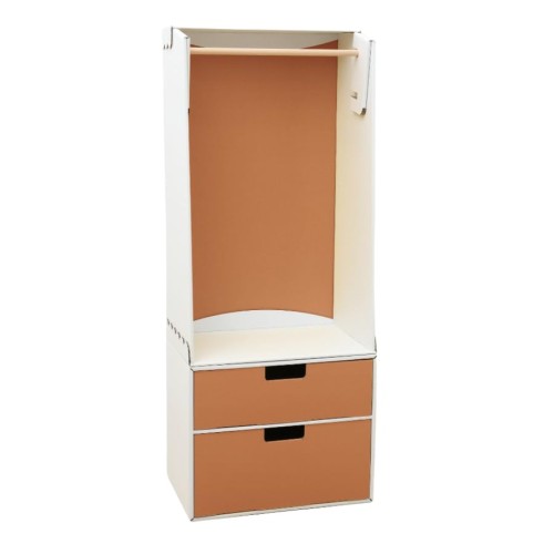 セット内容/本体×1セット、面ファスナー×4組 サイズ/高さ約112.5(cm)・幅約45.5(cm)・奥行き約28.5(cm) 重量約3,100(g) チェスト天面の耐荷重16.5(kg) チェスト1引き出しあたりの耐荷重2.1(kg) ハンガーポール耐荷重約5(kg) 素材/本体:紙、ハンガーポール:天然木、プラネジ:ポリエチレン、面ファスナー:ナイロン、両面テープ:紙、不織布、アクリル系粘着剤、滑り止めシール:クロロプレンゴム、金枠:鉄 組立式 組立目安時間:ハンガーラック30分・チェスト20〜30分) 大人が組み立ててください。 生産国/日本