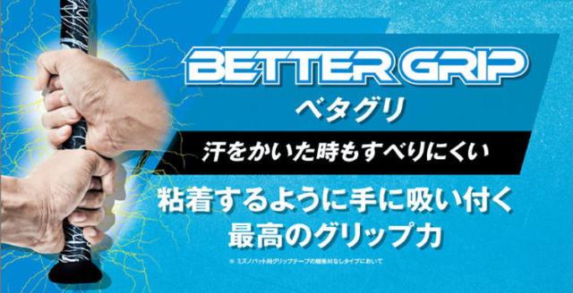 | 特徴 | ベターグリップテープ略してベタグリ! ミズノ野球グリップテープ史上最高のグリップ力。 (※緩衝材無しタイプにおいて) (1)手に吸い付き、すべりにくいのでスイングがしやすい。 (2)発汗時、雨天時もすべりにくくしっかり握れる。 (3)巻き替えが簡単な粘着テープを使用 硬式野球、軟式野球、少年野球対応。 もっと打てるようになりたい! バットを握りやすくするために欠かせないグリップテープ。 グリップテープは消耗が激しいため、 定期的に巻き直してメンテナンスしていくことがとても重要です。 グリップテープは打撃のパフォーマンスに影響を与える 大事なアイテムです! 握力が強い人は薄め、弱い人は厚めがおすすめです。 自分に合ったグリップテープをしっかりと見極めて、 パフォーマンスの向上を目指しましょう! バットを握りやすくし、バッティング力をサポートします。 バットのグリップ部分に巻いて使用。 もともと巻かれている場合でも、状態を確認することが大事です。 グリップ力が低下したり剥がれたりすると、 バッティング力に直接影響が出てしまいます。 バットのパフォーマンスを維持するために、定期的なメンテナンスで グリップテープを巻き直すことをおすすめします。 グリップが滑りにくくなれば手のマメ予防になり、 クッション性があればボールの衝撃を吸収するので手の保護にも効果的です。 厚めのものを巻けば握力の補助にもなります。 クッション性重視なら厚め、飛距離優先なら薄めがおすすめです。 |