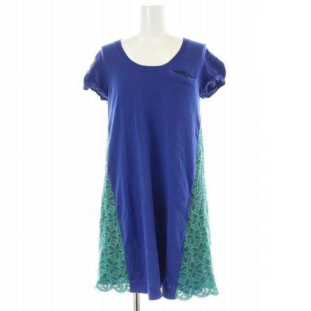【中古】サカイラック sacai luck レース半袖カットソーワンピース ひざ丈 ニット 切替 1 青 ブルー 緑 グリーン