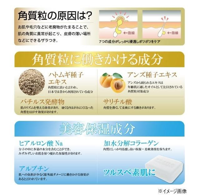 | 成分 | 石ケン素地、グリセリン、コカミドプロピルベタイン、ベントナイト、ハトムギ種子エキス、アンズ種子エキス、バチルス発酵物、サリチル酸、ヒアルロン酸Na、加水分解コラーゲン、アルブチン、ビルベリー葉エキス、アロエベラ葉エキス、水、BG、エタノール、PG、PEG-75、エチドロン酸、EDTA-4Na |