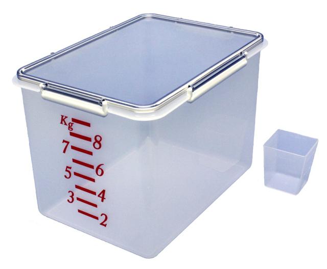 ●4点ロックとパッキン付蓋でしっかり密閉できる米びつ ●お米10kgサイズ ●お米の量が確認しやすいクリアタイプ ●1合計量カップ付