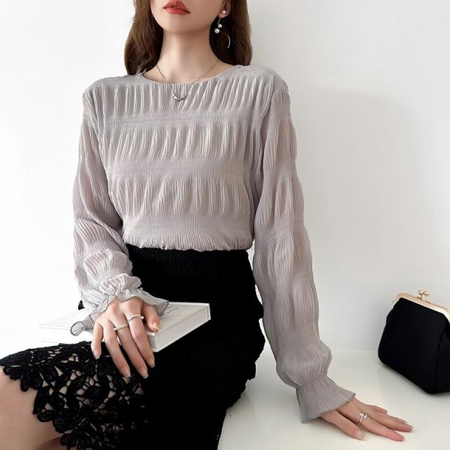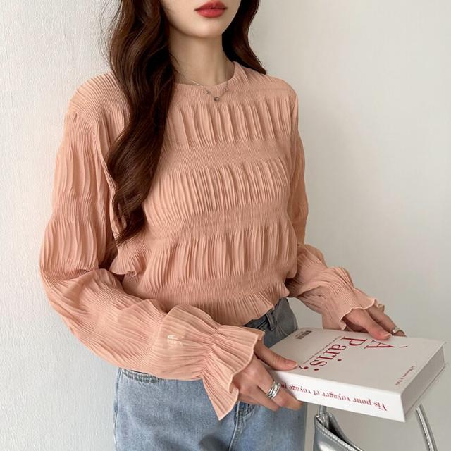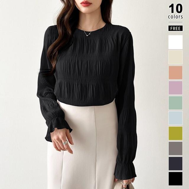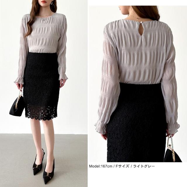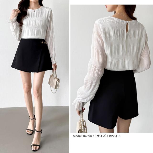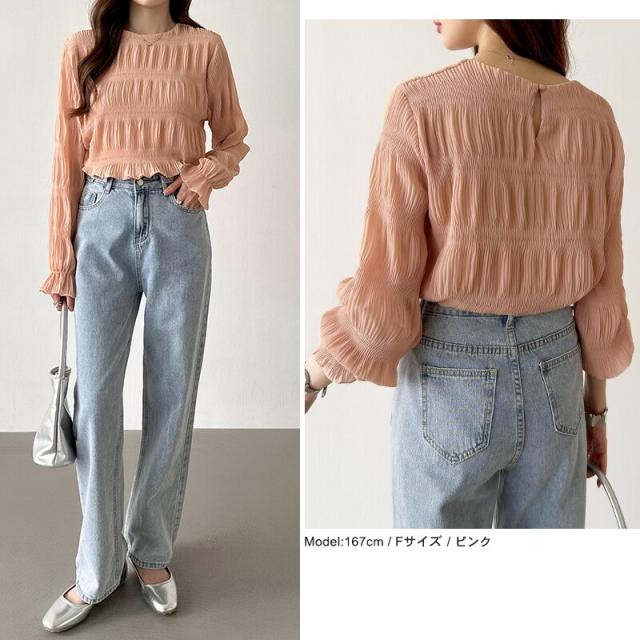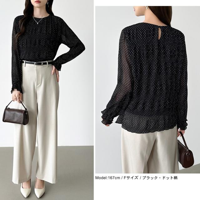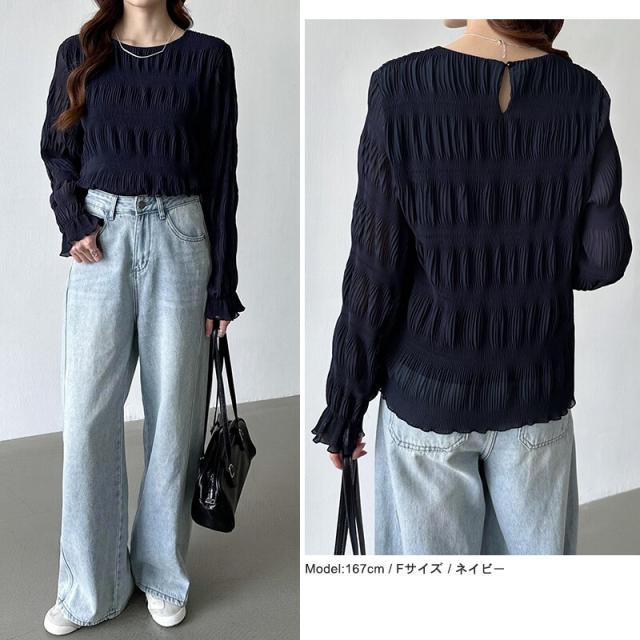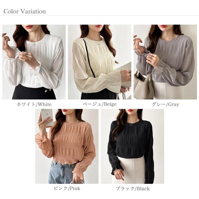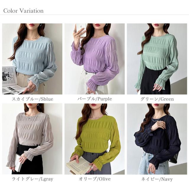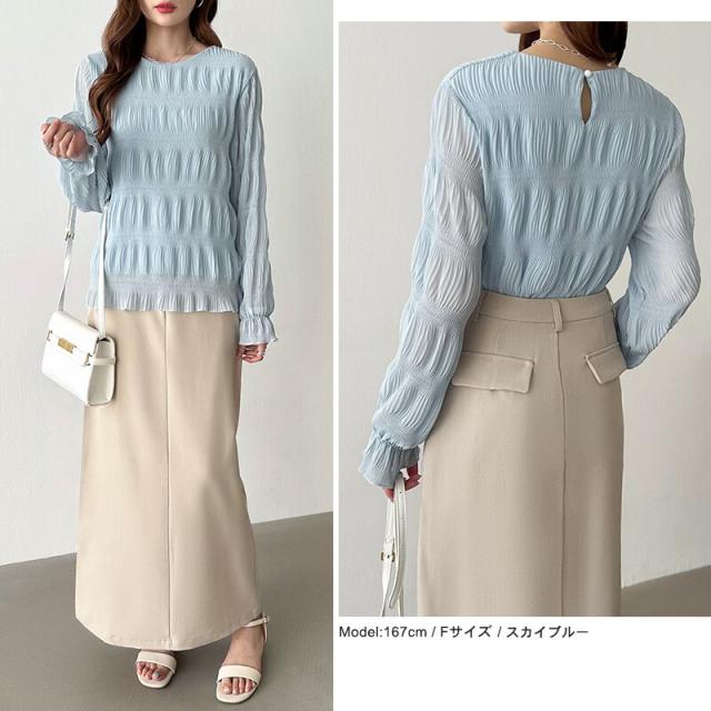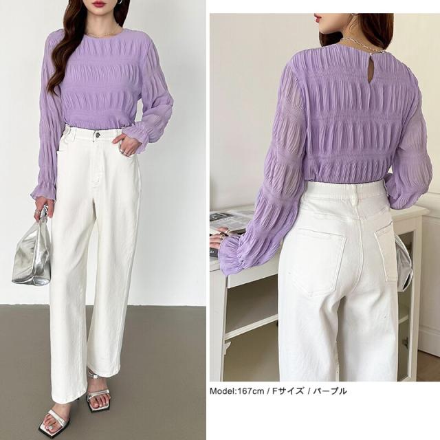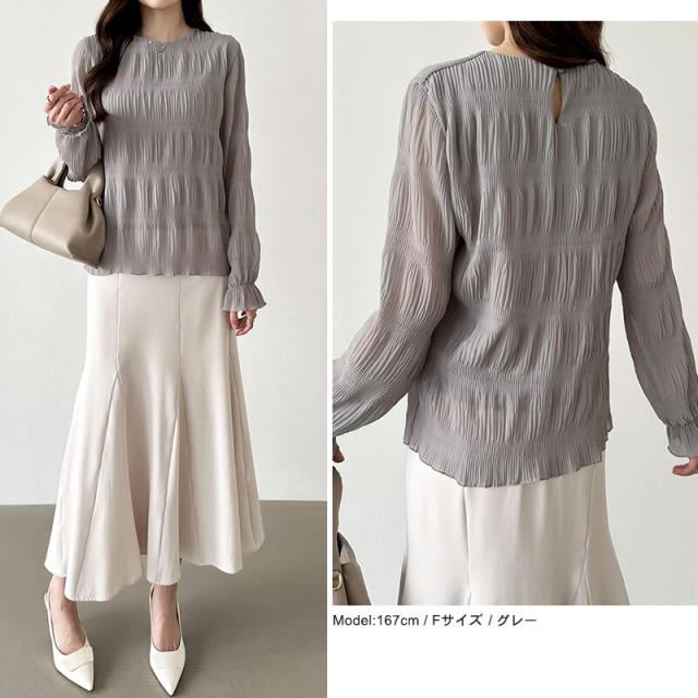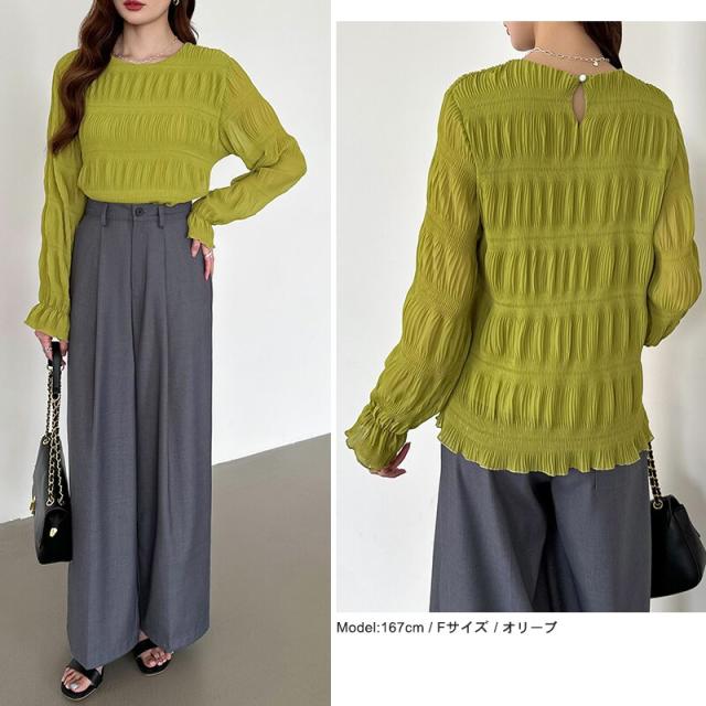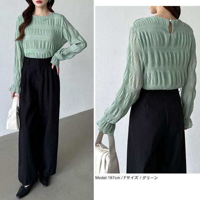 シャーリングブラウス シフォン ブラウス フリル ラウンドネック シアー トップス 長袖 レディース
