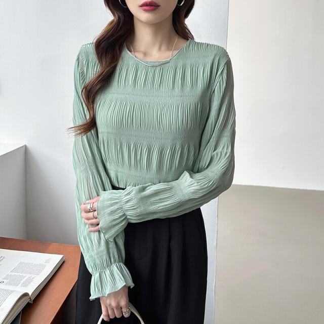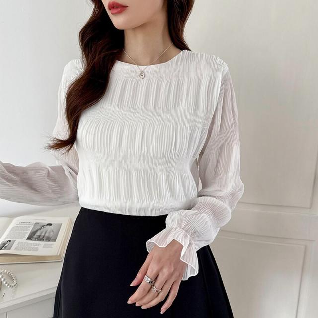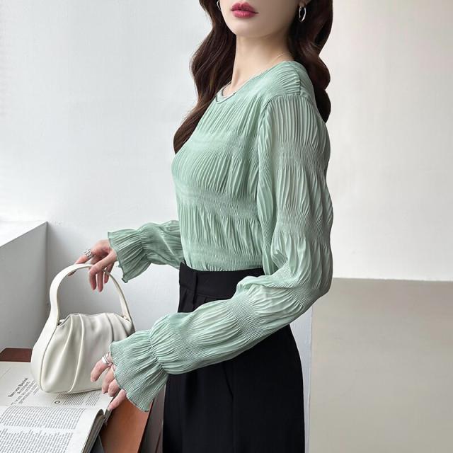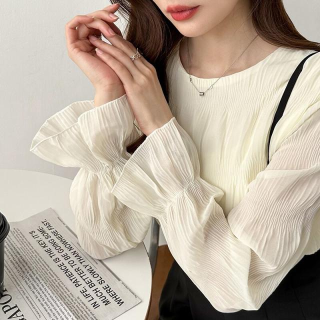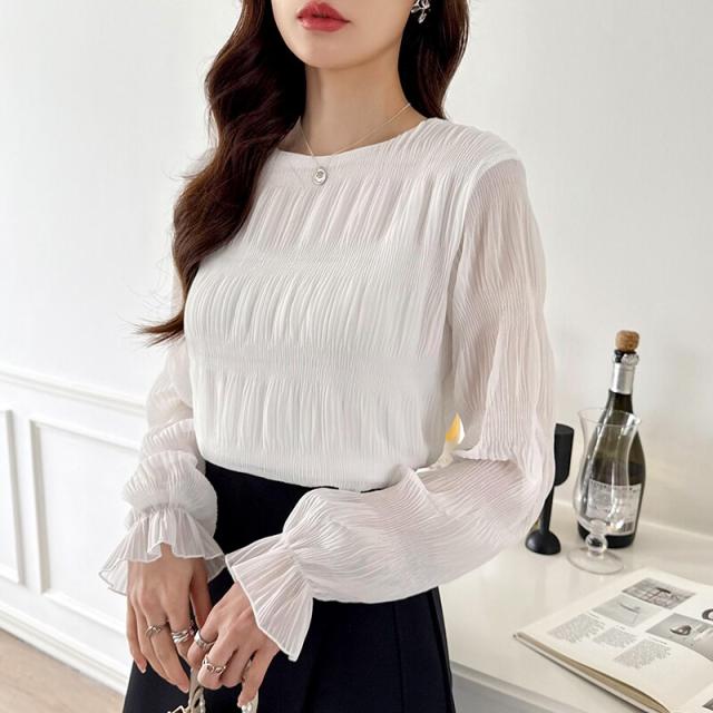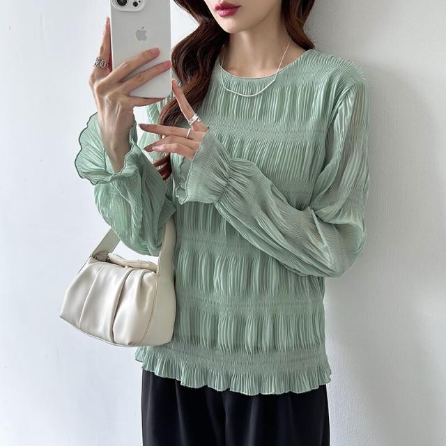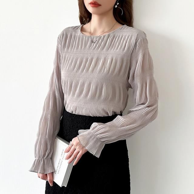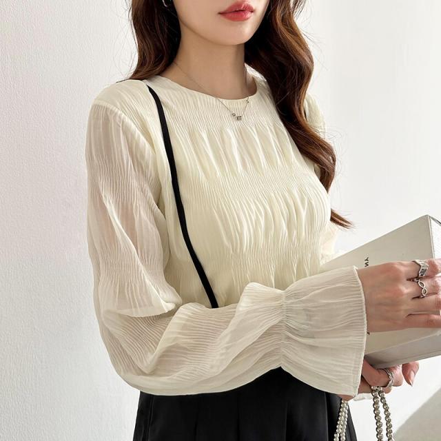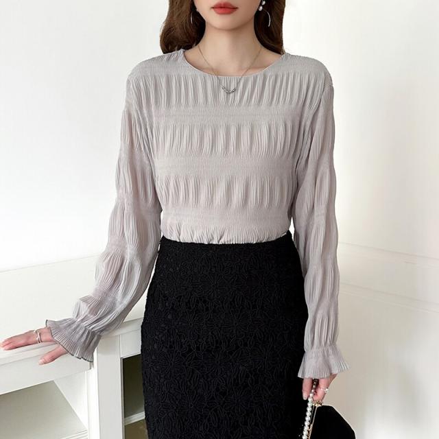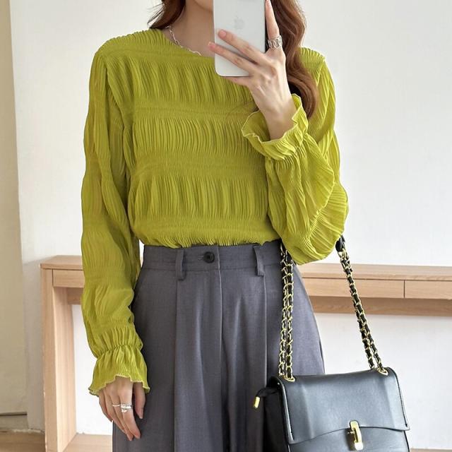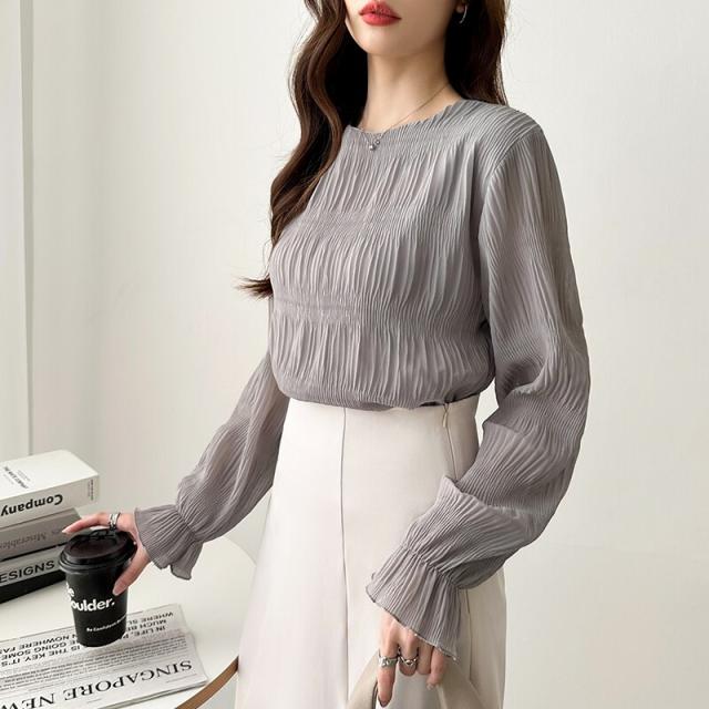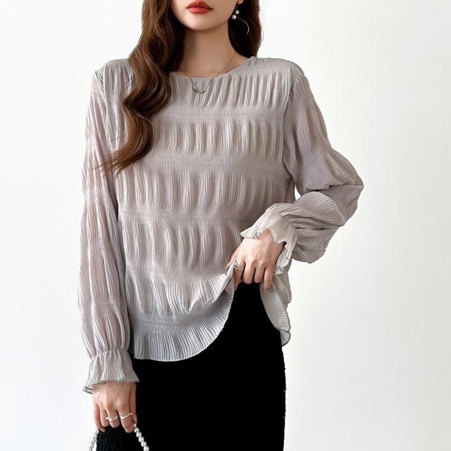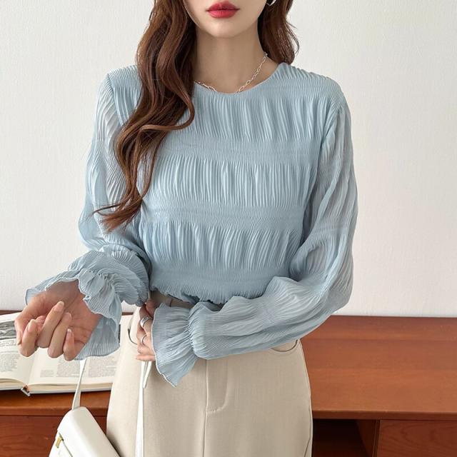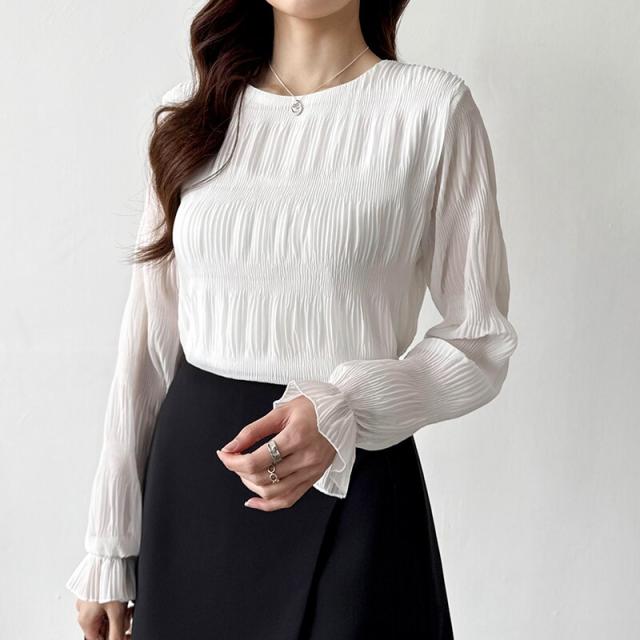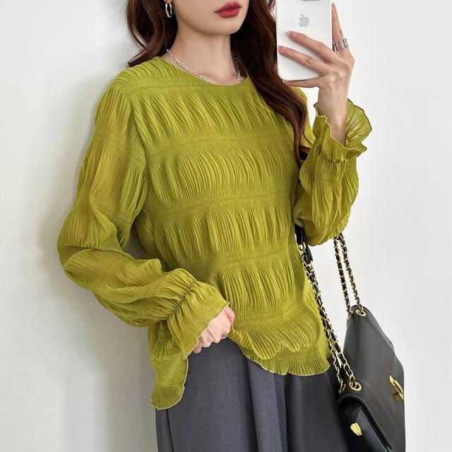 シャーリングブラウス シフォン ブラウス フリル ラウンドネック シアー トップス 長袖 レディース