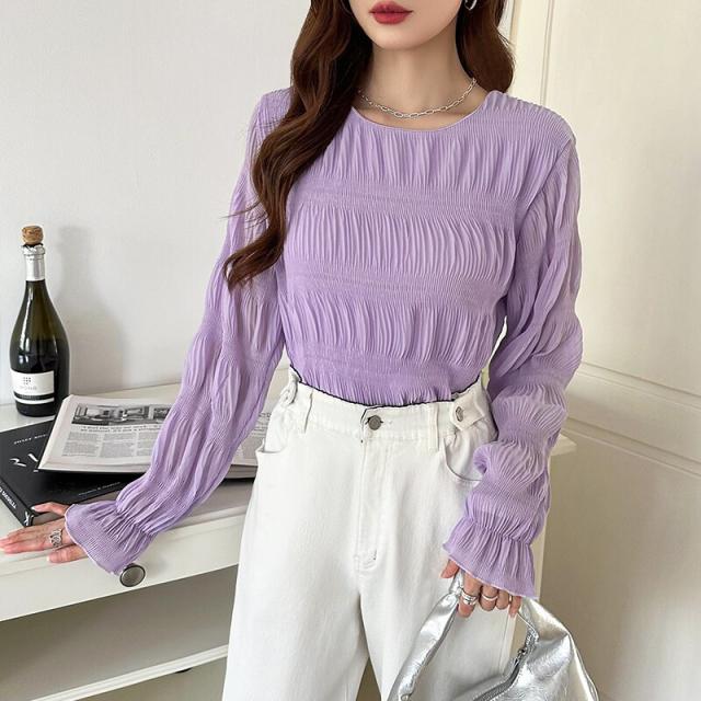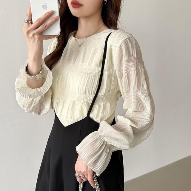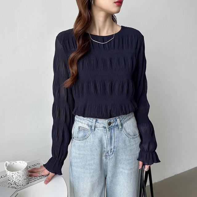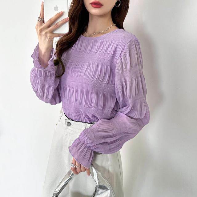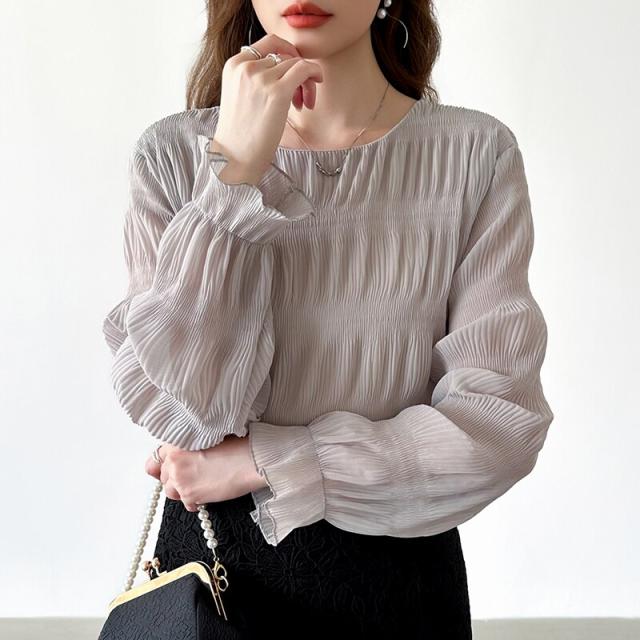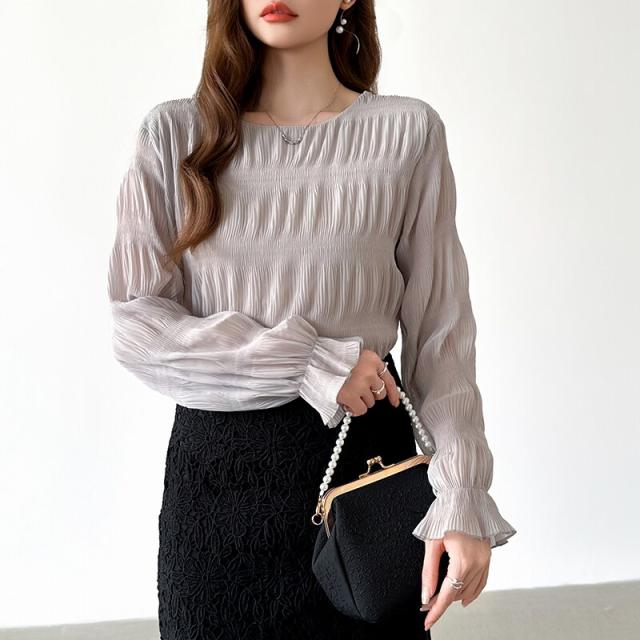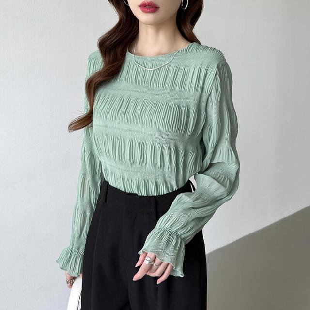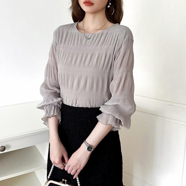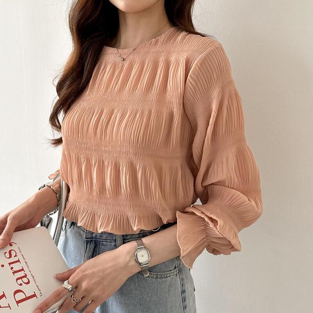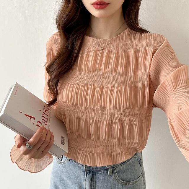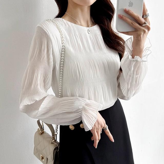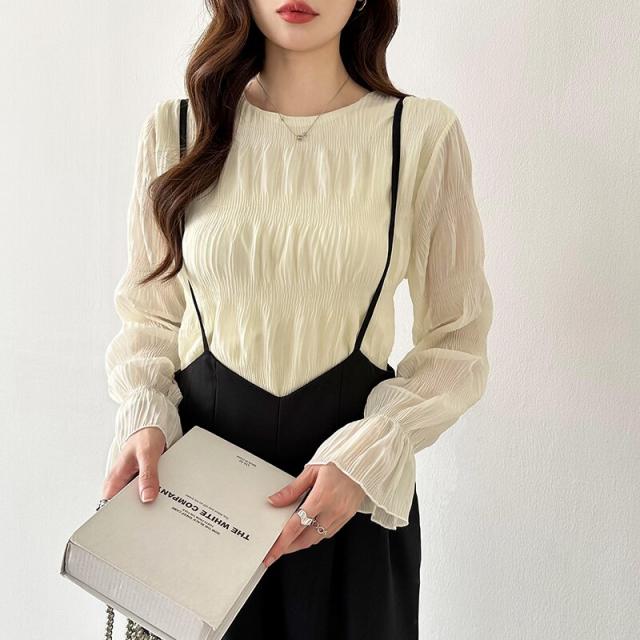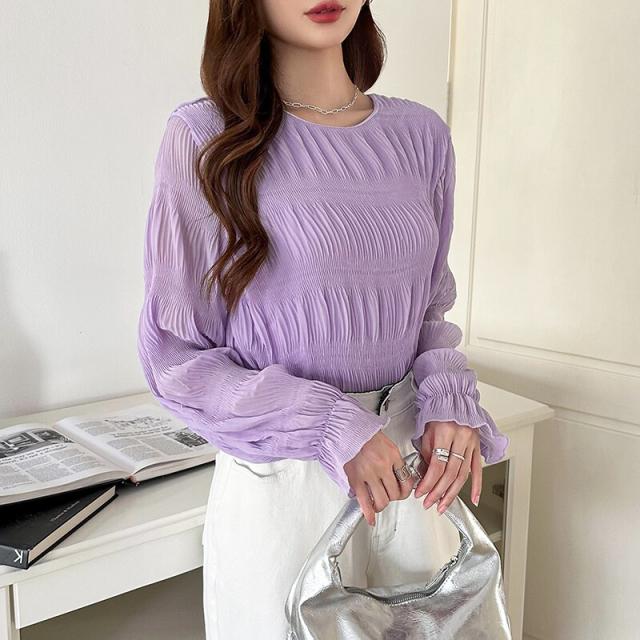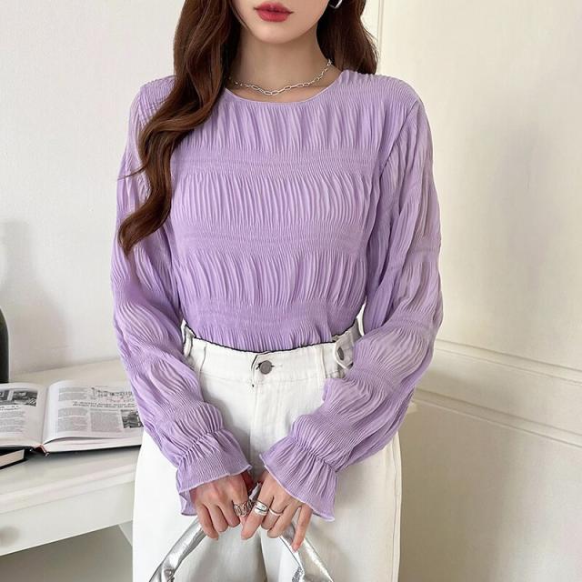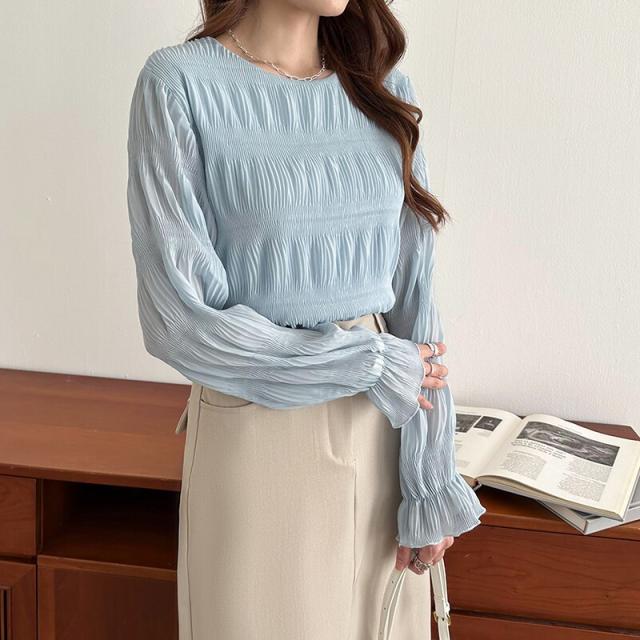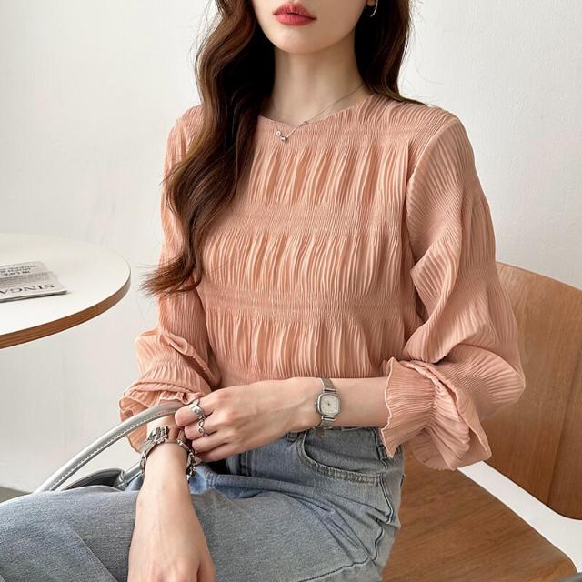 シャーリングブラウス シフォン ブラウス フリル ラウンドネック シアー トップス 長袖 レディース