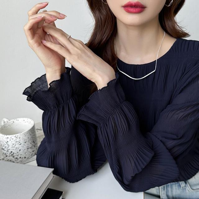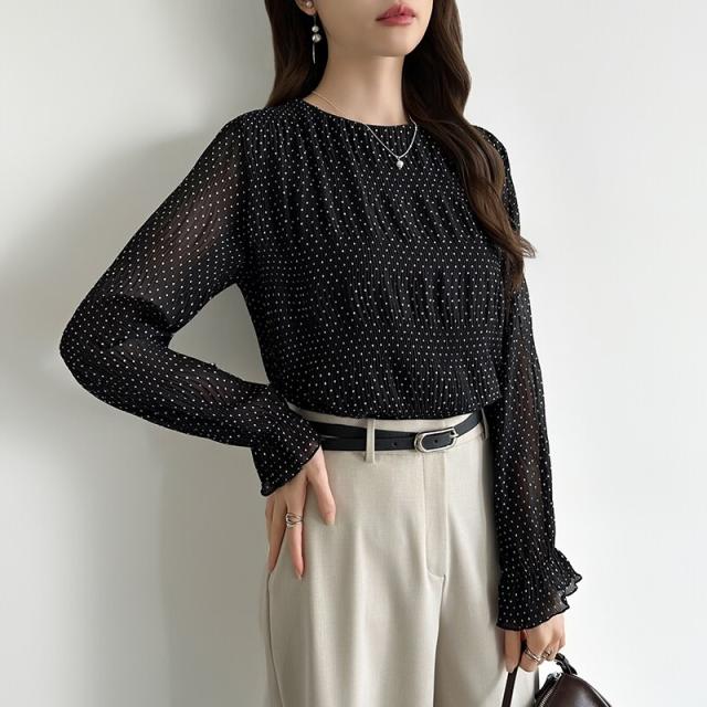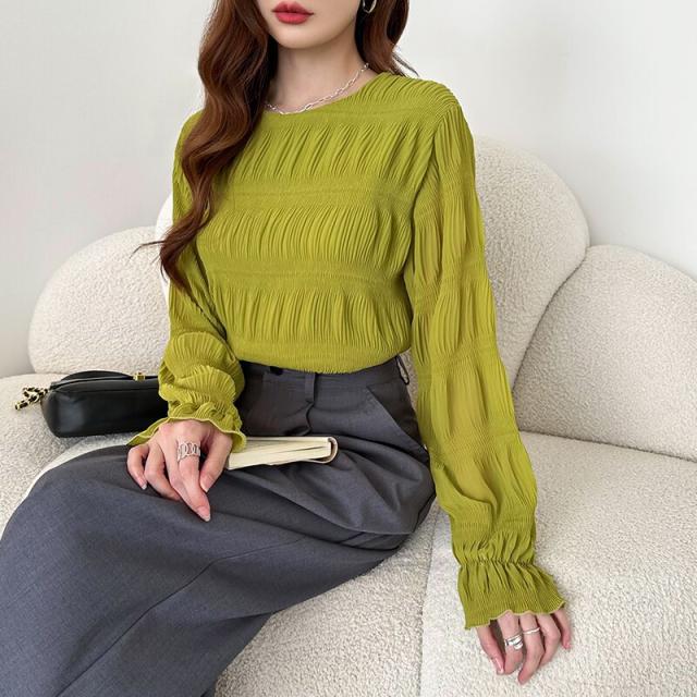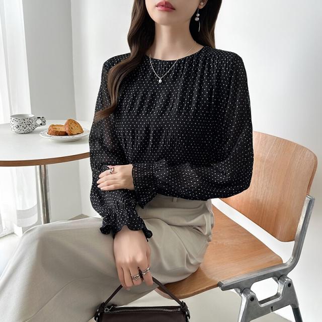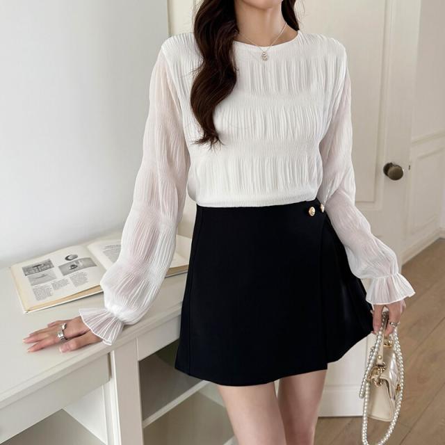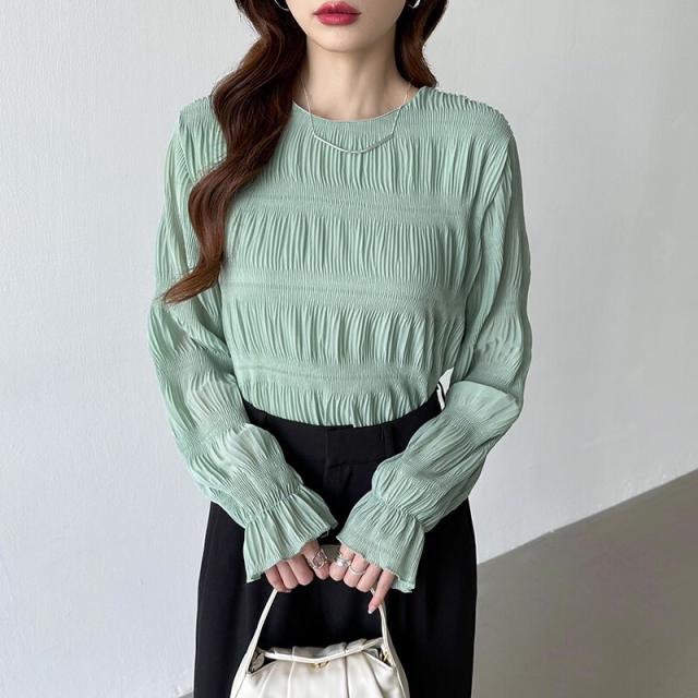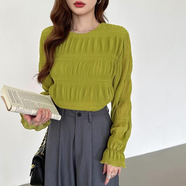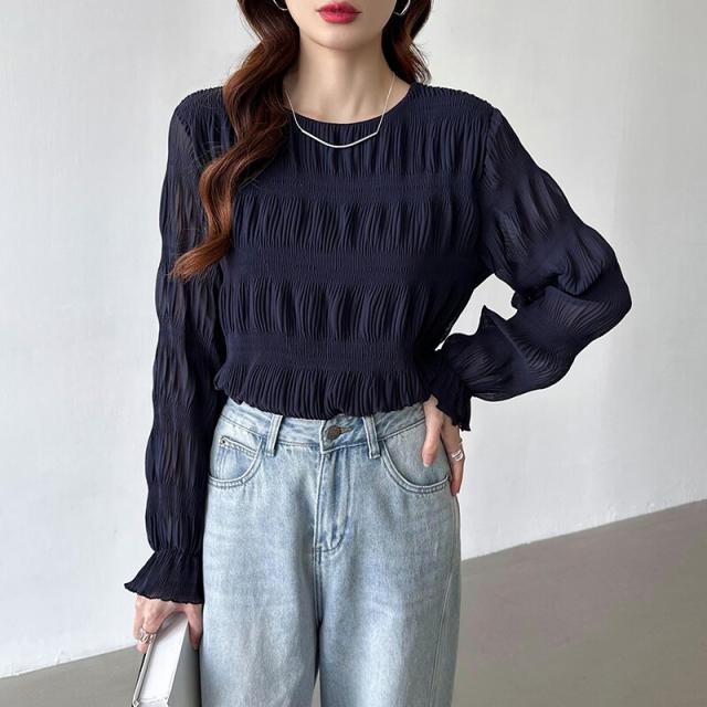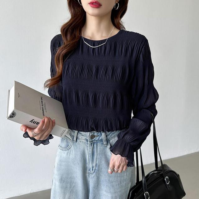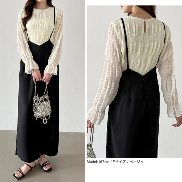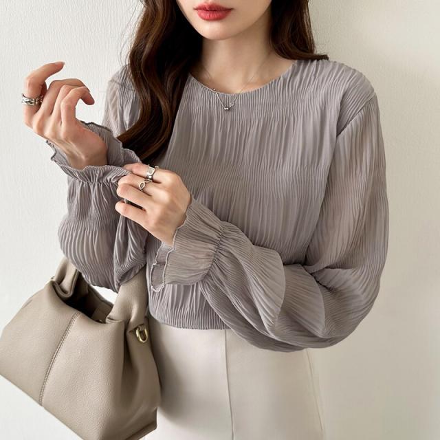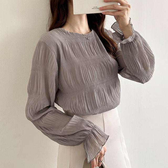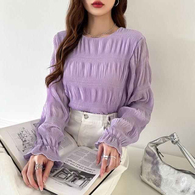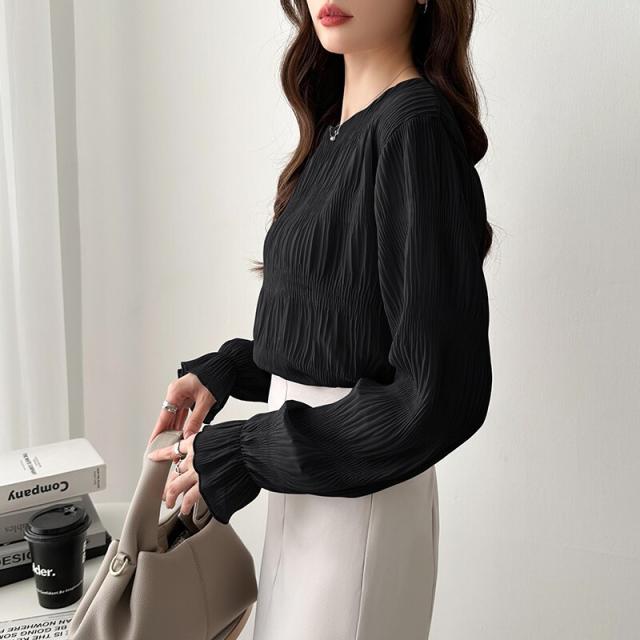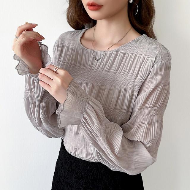 シャーリングブラウス シフォン ブラウス フリル ラウンドネック シアー トップス 長袖 レディース