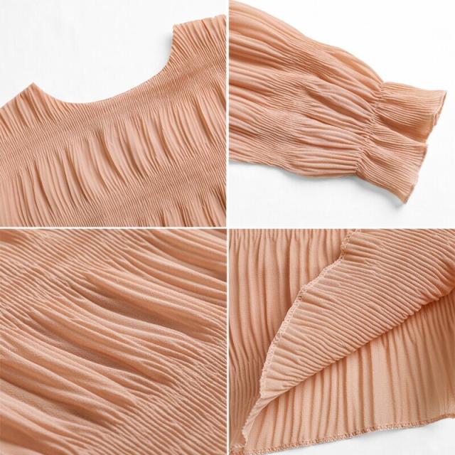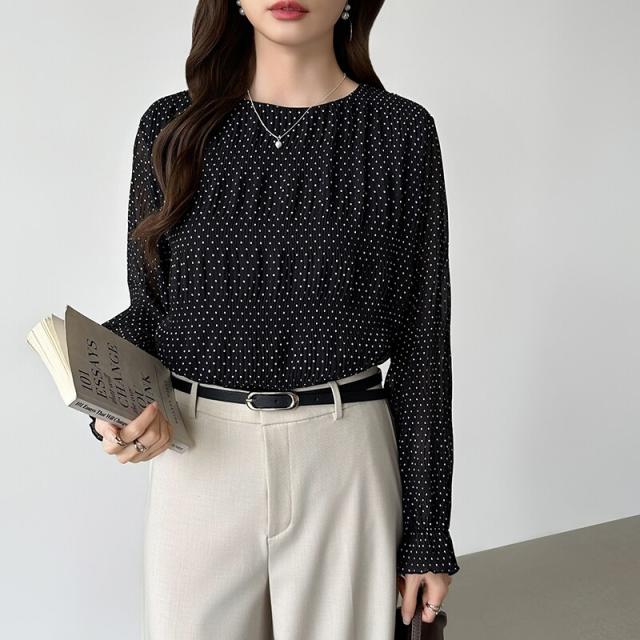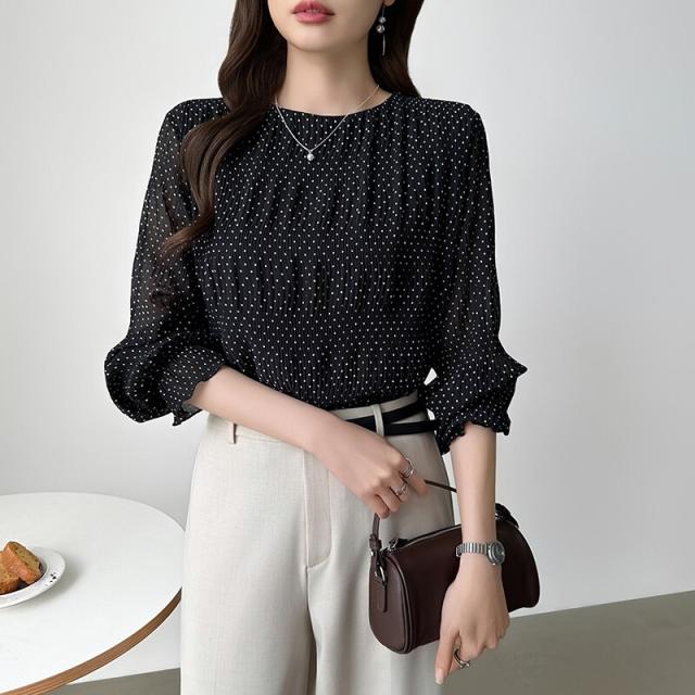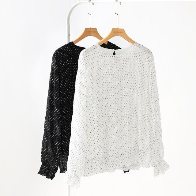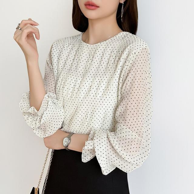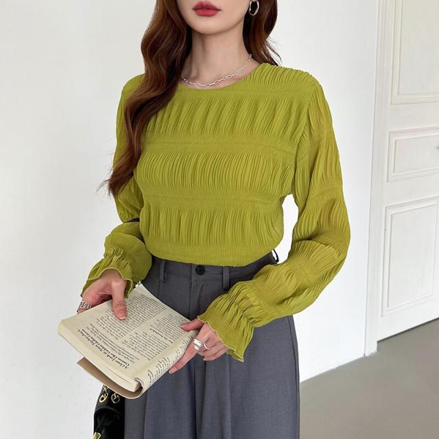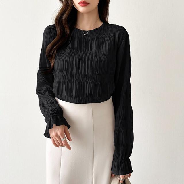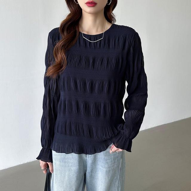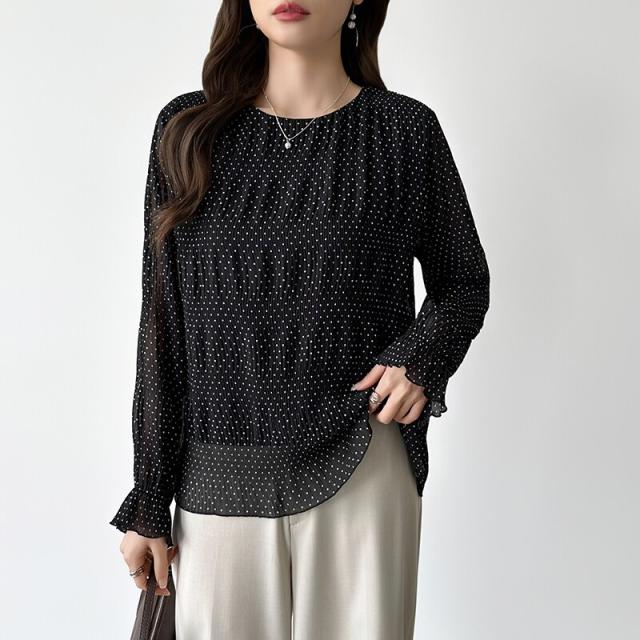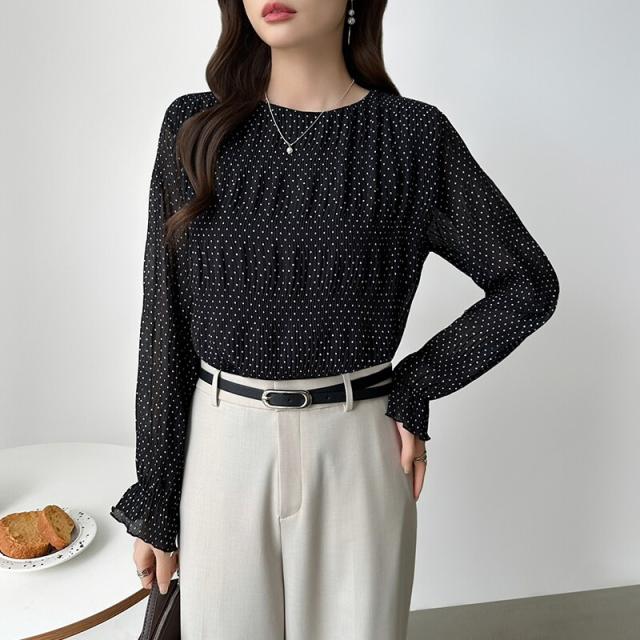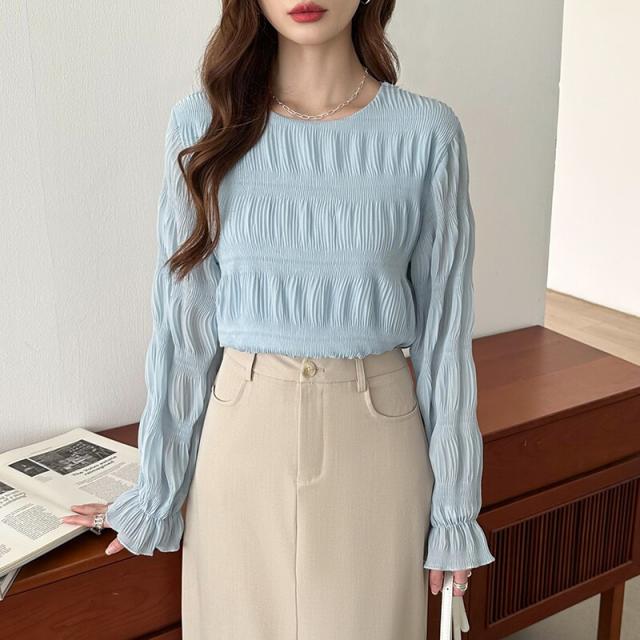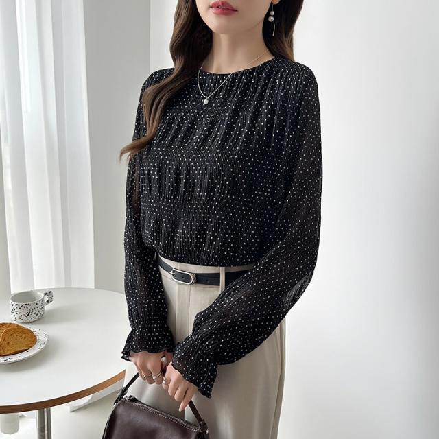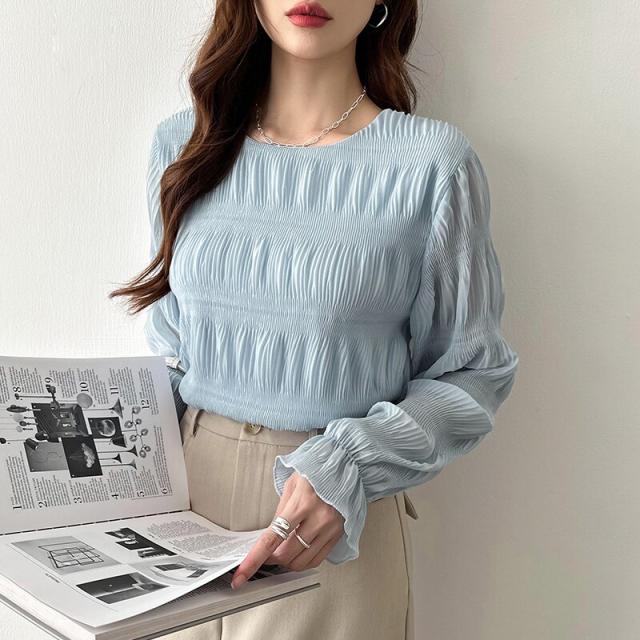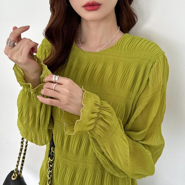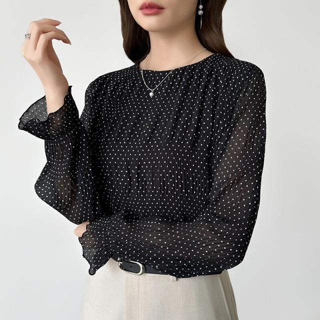 シャーリングブラウス シフォン ブラウス フリル ラウンドネック シアー トップス 長袖 レディース