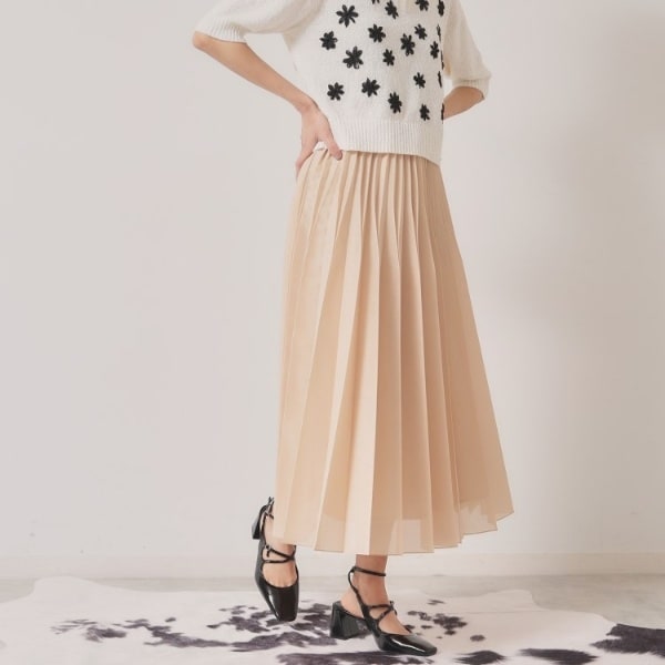 腰下で切り替えたアコーディオンプリーツが抜け感と軽やかさを演出するロングスカート。