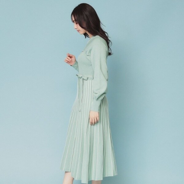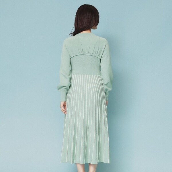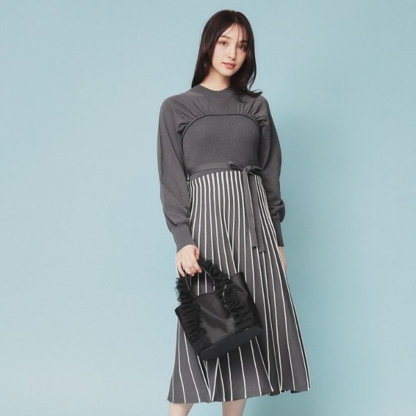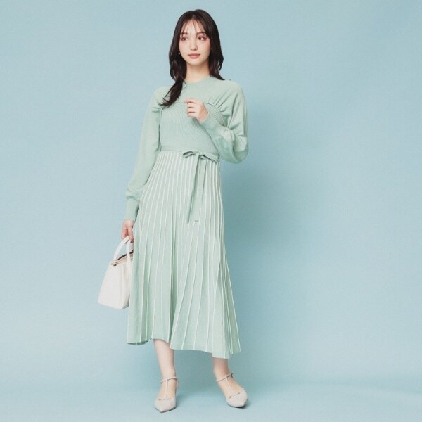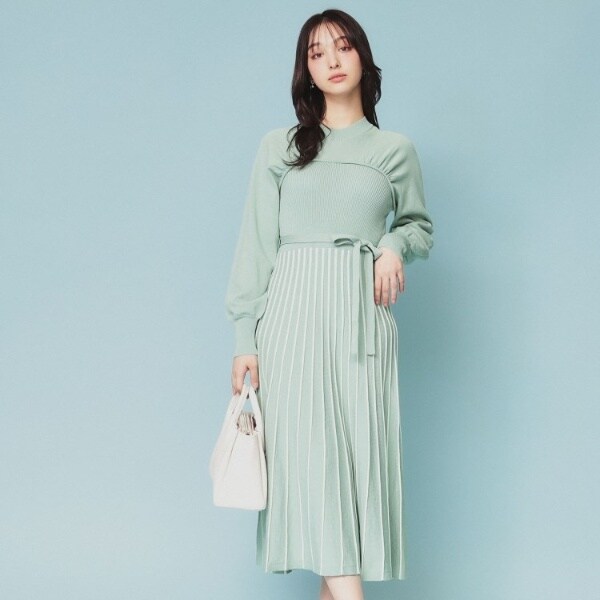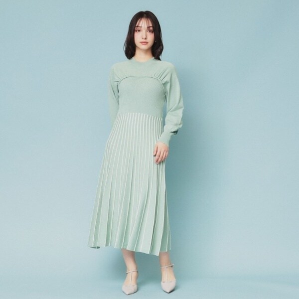 ・ビスチェのような切替にバイカラーのプリーツスカートを合わせたニットワンピース。