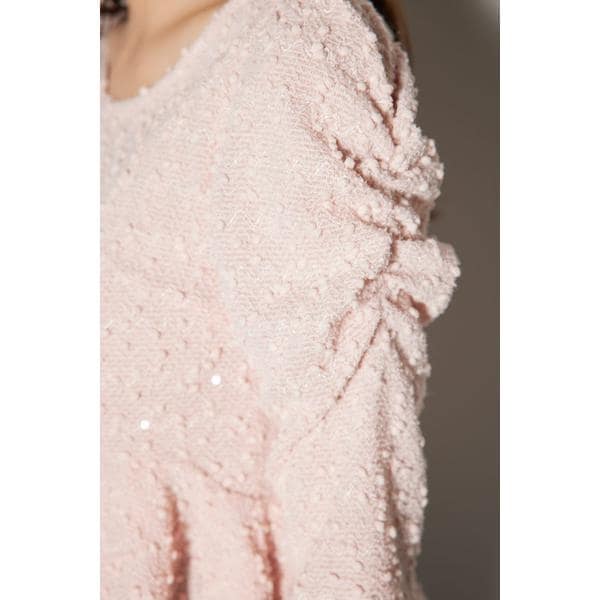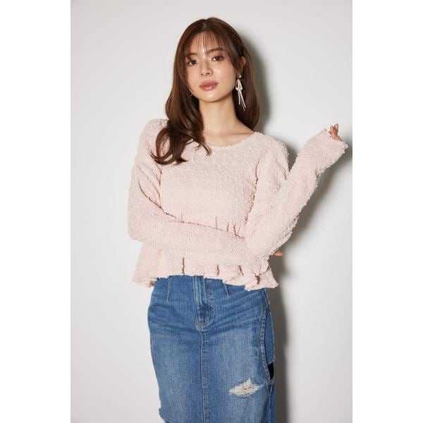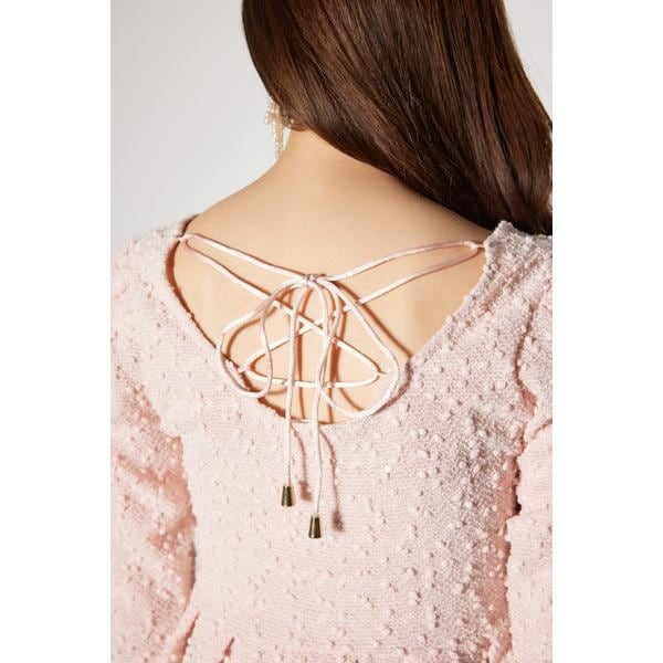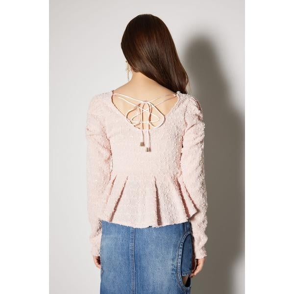 【さりげなく光るスパンコールとバックコンシャスなデザインが目を惹くレディなトップス】■ポイント表面感があり伸縮性のある生地でペプラムがポイントのトップス。袖山にもギャザーを施しレディーな印象に。キレイ見えしながらもリラックスして着用いただける1枚です。■ディテールペプラムにはギャザーだけでなくタックをほどこしすっきり見えるように調節。背中は下着が見えない開き具合で首から背中にかけてキレイにみえるようこだわりました。紐で調節可能なのでサイズフリーにご着用いただけます。袖口の小さめフリルがさりげなく手元を華やかに彩ります。■スタイリングデニムあわせでカジュアル×フェミニンやタイトスカート合わせでレディな印象にも◎■生地透け感:なし裏地:なし伸縮性:あり光沢感:スパンコールの光沢あり厚さ:普通■商品のお気に入り登録お気に入りアイテムの再入荷・在庫1点などの通知を受け取ることができます。[注意事項]※画像の商品はサンプルです。実際の商品と仕様、加工が若干異なる場合があります。※画像の商品は光の照射や角度、お使いのモニター環境により、実物と色味が異なる場合がございます。※着用、お取り扱いの際は、アテンションタグをご確認ください。