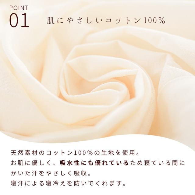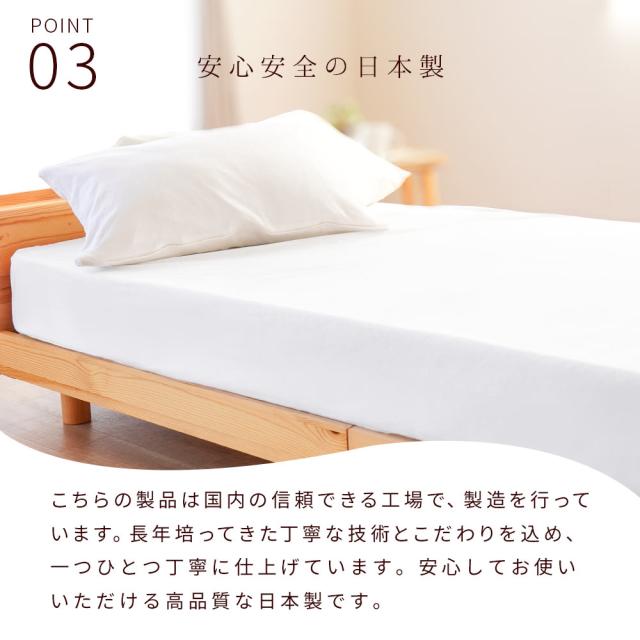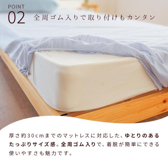 | ・肌にやさしいコットン100% 天然素材のコットン100%の生地を使用。お肌に優しく、吸水性にも優れているため寝ている間にかいた汗を優しく吸収。寝汗による寝冷えを防いでくれます。 ・全周ゴム入りで取り付けカンタン厚さ約30cmまでのマットレスに対応した、ゆとりのあるたっぷりのサイズ感。全周ゴム入りで、着脱が簡単にできる使いやすさも魅力です。 ・安心安全の日本製こちらの製品は国内の信頼できる工場で、製造を行っています。長年培ってきた丁寧な技術とこだわりを込め、一つひとつ丁寧に仕上げています。安心してお使いいただける高品質な日本製です。 ・カラーは選べる4色お部屋に馴染みやすいシンプルな4色をご用意しました。 | |