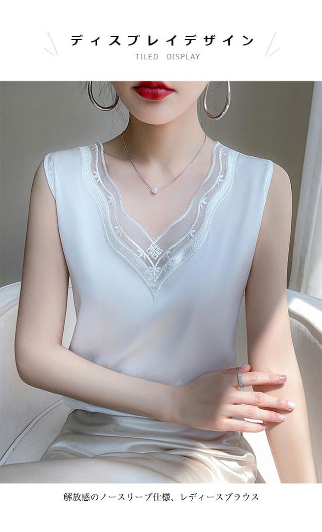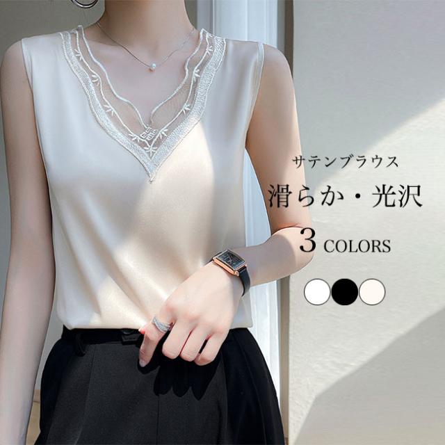 滑らかな風合い&上品な光沢感で魅せるサテン生地 レディースノースリーブブラウスレディースファッション トップス シャツ ブラウス